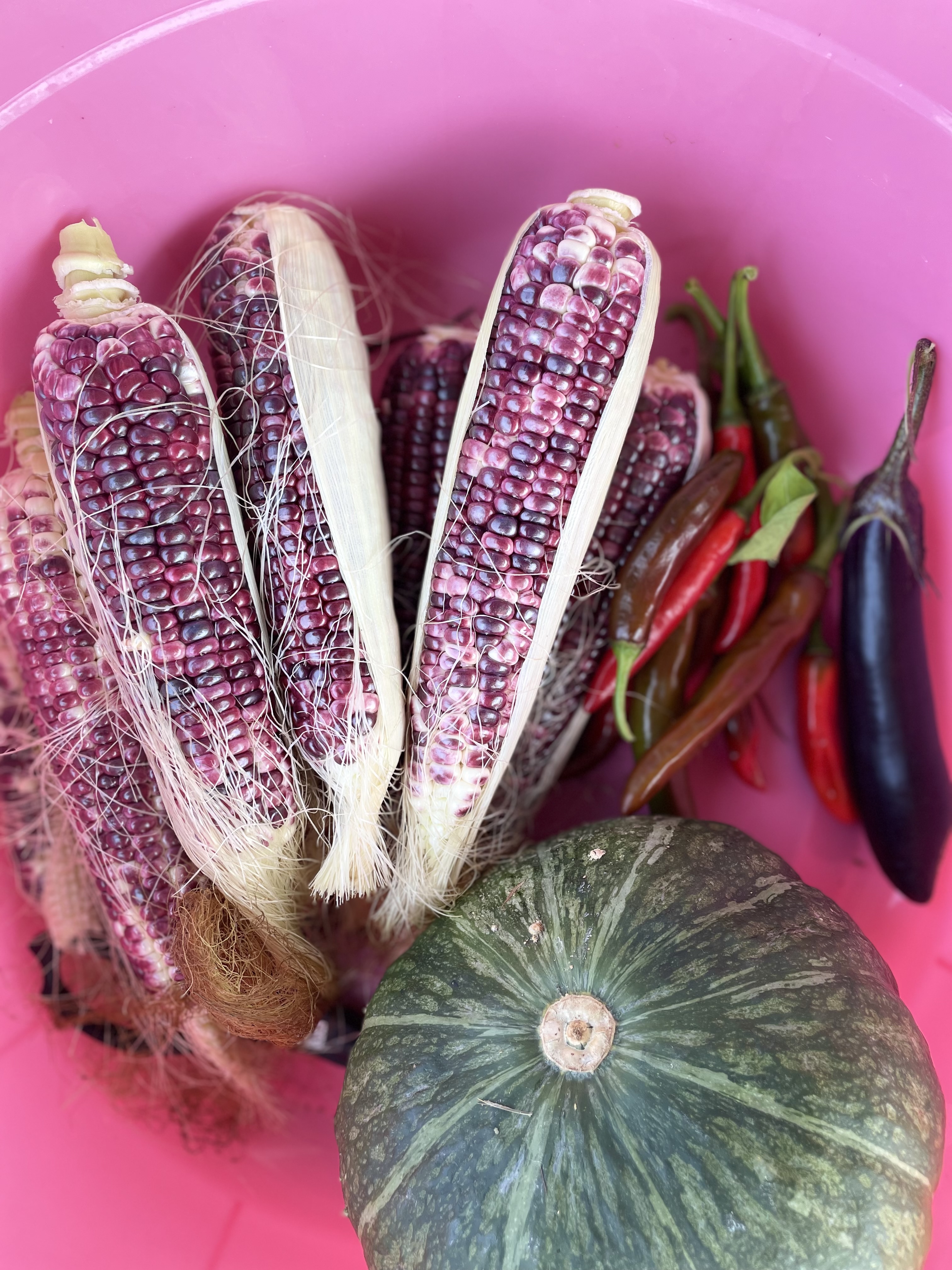 물주기. 가지정리. 옥수수수확. 호박잎, 고구마줄기 따기, 단호박수확