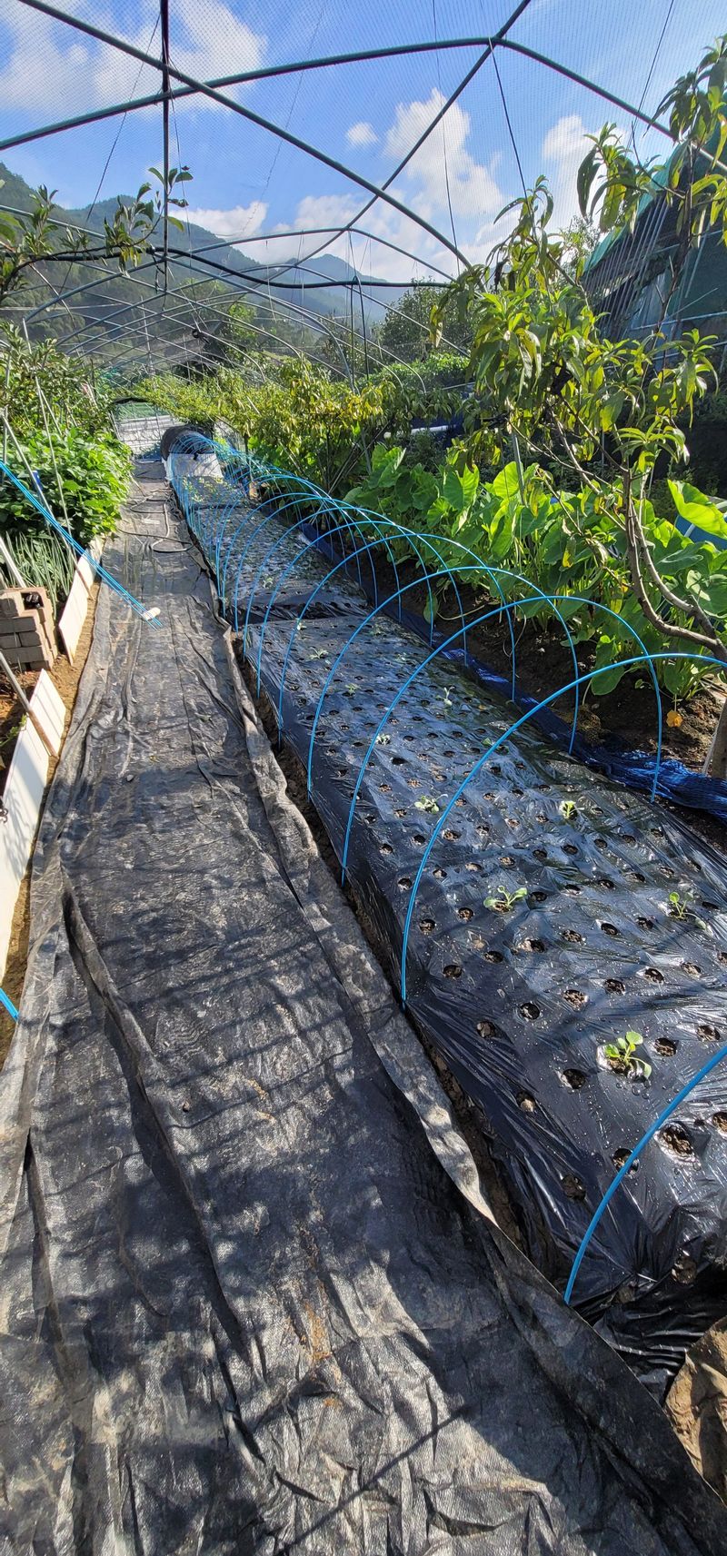 무, 당근은 점 씨 뿌리기 열무는 줄 뿌리기 활대 세우고, 한랭사 씌우고, 차광막 덮기