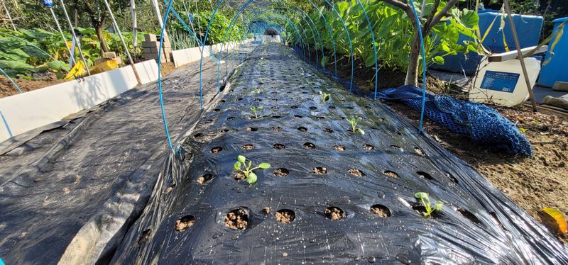 배추 3줄28포기, 브로콜리 2줄21포기, 양배추 2줄14포기 모종심고, 물주고, 활대 세우고, 한랭사 씌우고, 차광막 덮기, 종이컵 삽입하기