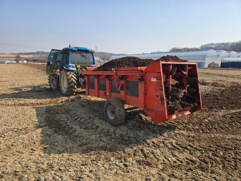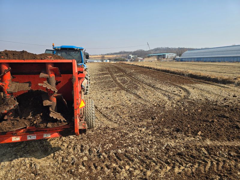 강자밭 예정지 퇴비살포 우분300평당6000kg살포함 장비. 트렉터 살포기 포크레인 일력 자가1명