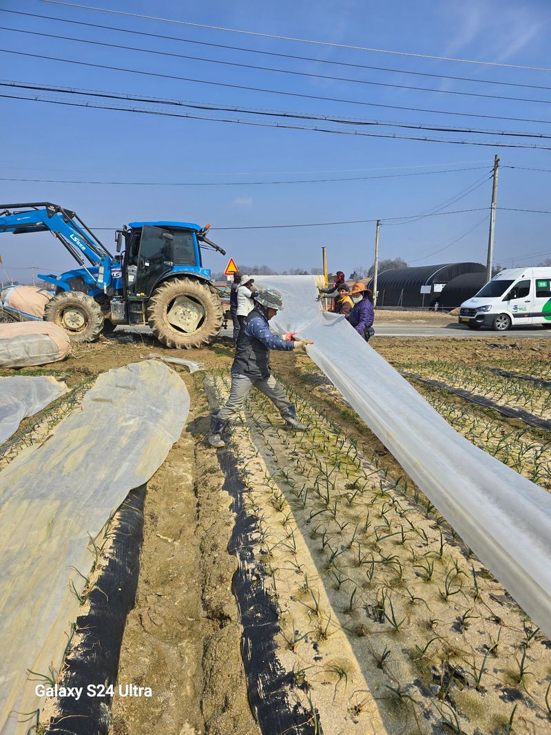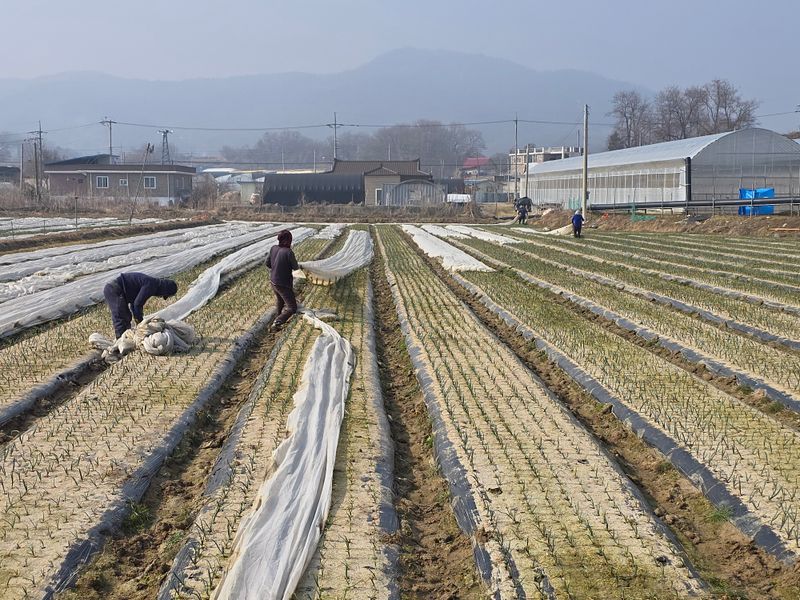 양파 부직포 제거작업 유난히도 추운겨울 지나가고 봄 앚이준비함
