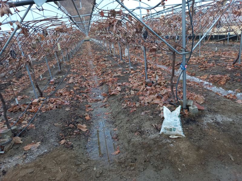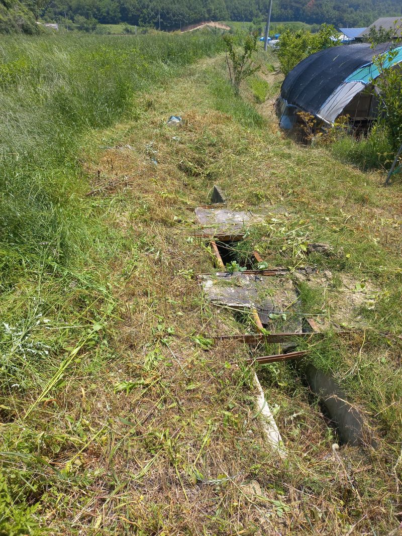 포도나무 가지 파쇄한것 ㆍ도랑에있던 잎 쌓인것 ㆍ정리하고 물 스프링클러로 관수함 ㆍ