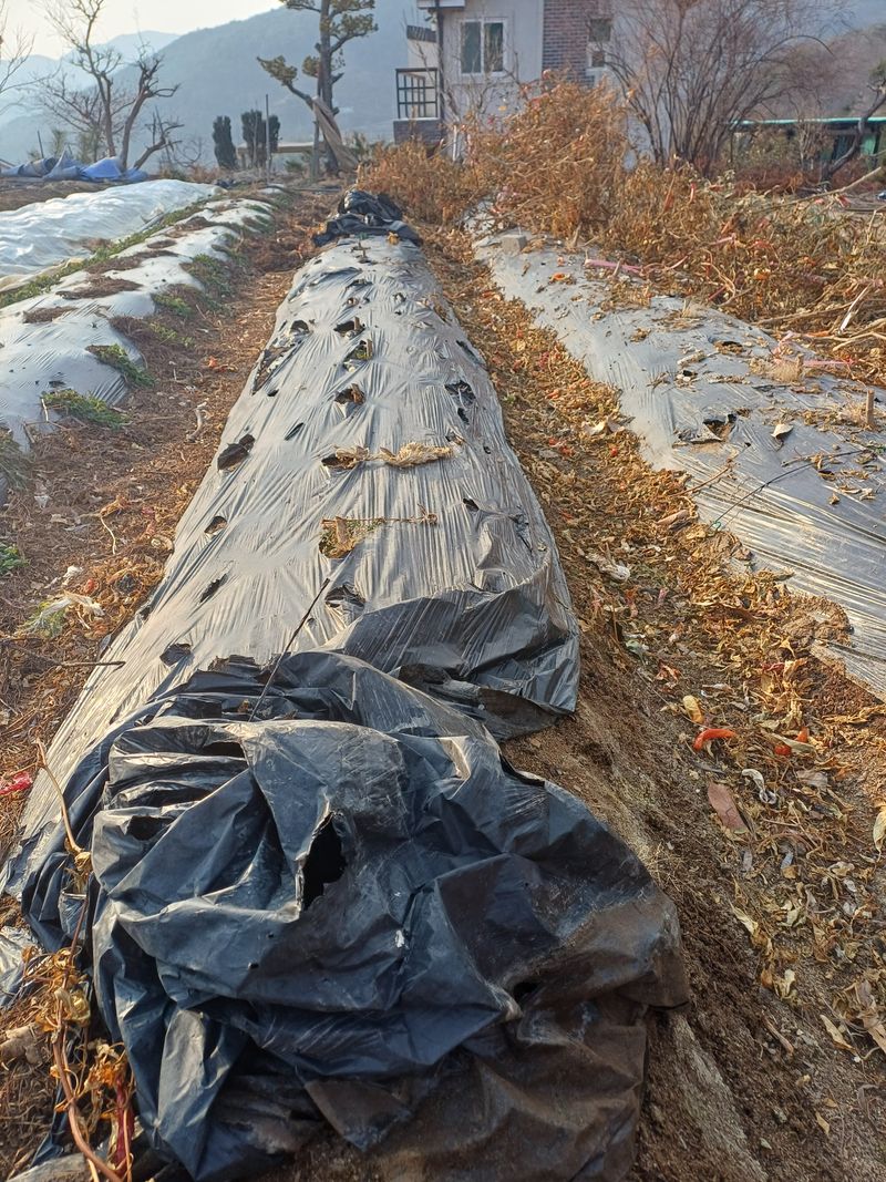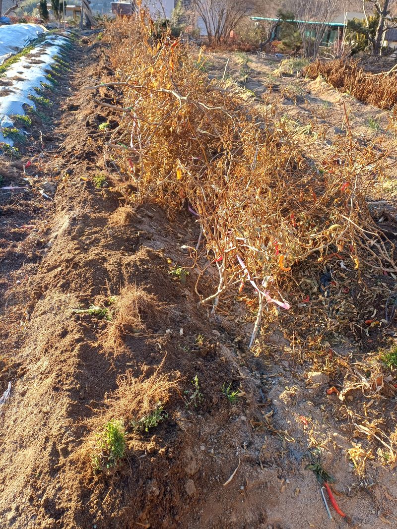 전년도에 고추 수확후 뒷정리를 다 못하에 해야지 하면서 집안의 여려가지 사정으로 미루어 왔는데 날씨가 싸늘 하지만 고추 뿌리를 정리해야만 다음 경작에 도움이될것같아서 추위를 무릅쓰고 고추뿌리를 쇠스랑으로 다 캐어서 노출 시켜읍니다