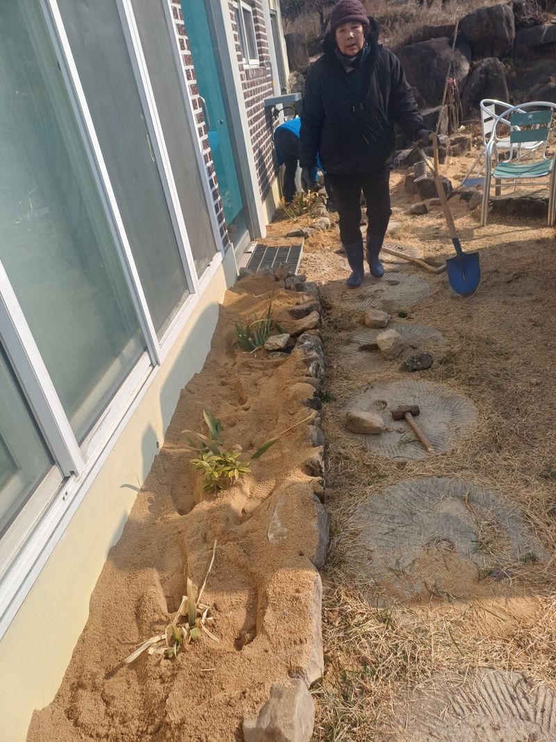 오늘 오전 부터 바람이 세차게 불어 싸늘한 날씨다,아침 식사후 이사장과 처는 화물차로 흙 을 구입하기 위해 출발 하여 11경 도착하였다.추운날이지만 경계석을 싸고 돌 사이사이. 흙으로 메우면서 단단하게 싸았다, 추운 날이지만 다해 놓고보니 역시 잘했다는 생각이 앞섰다.