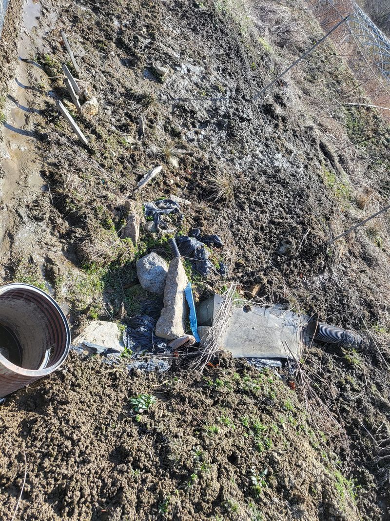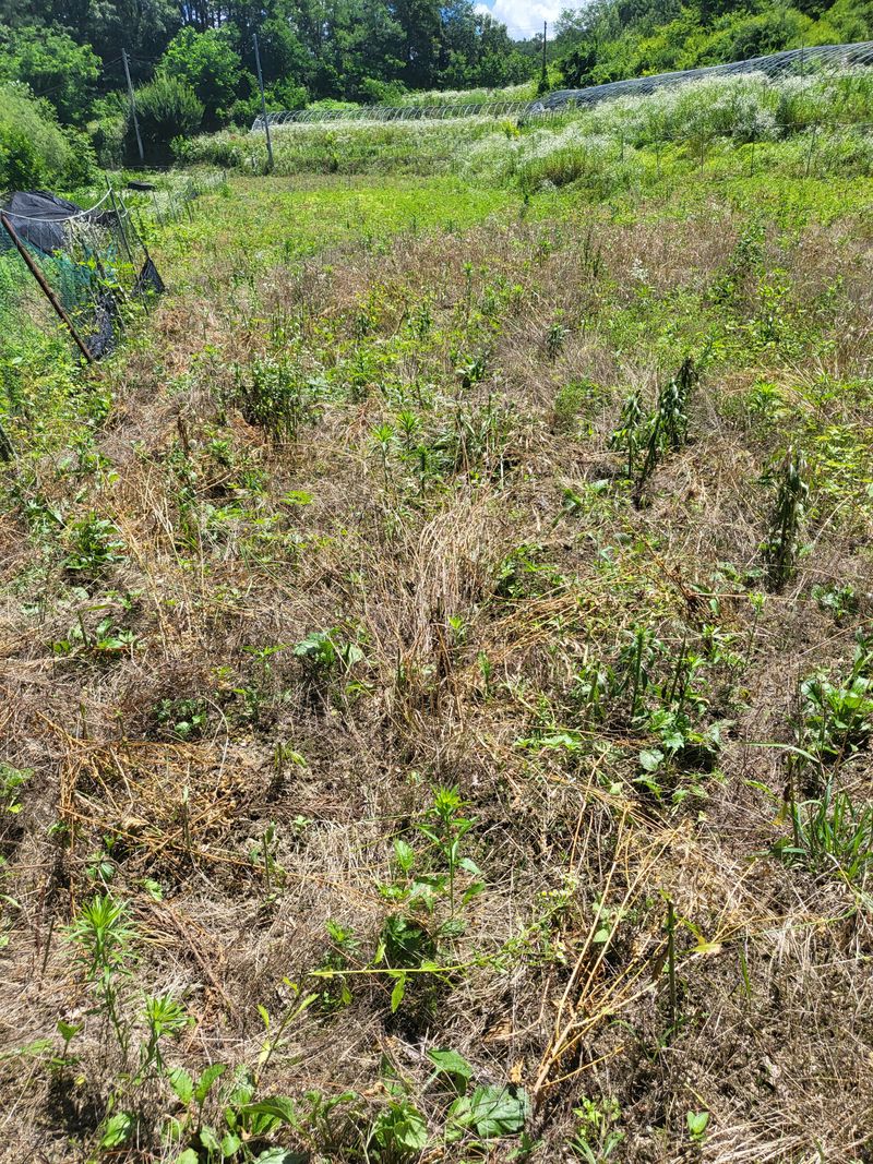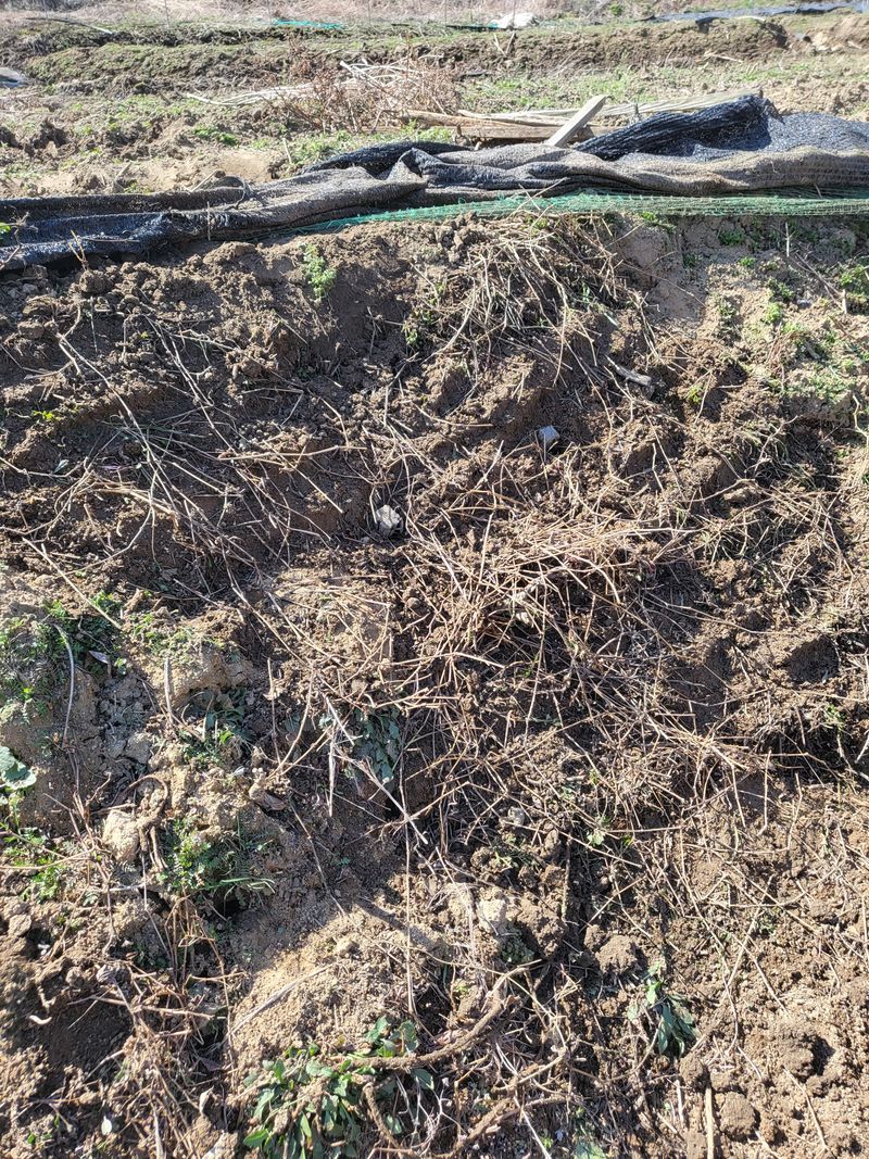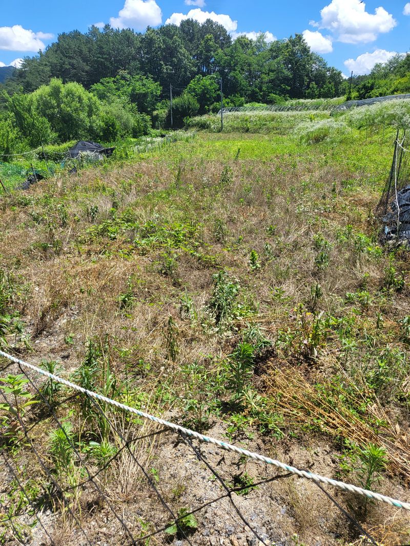 그물망 을 쳤는데 멧돼지가 들어와 한바탕 군데군데 휘젓고 갔네요 하나 하나 손질 하다보니 땀이 비오듯이 흘리고 가뭄에 풀은 왜 이리 잘자라는지~~ 제초제 까지 뿌렸습니다