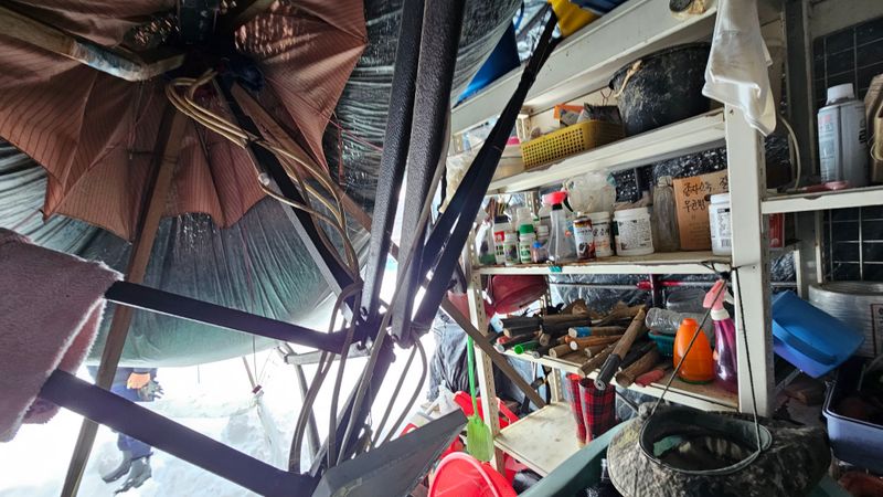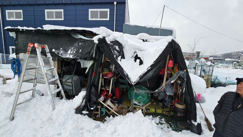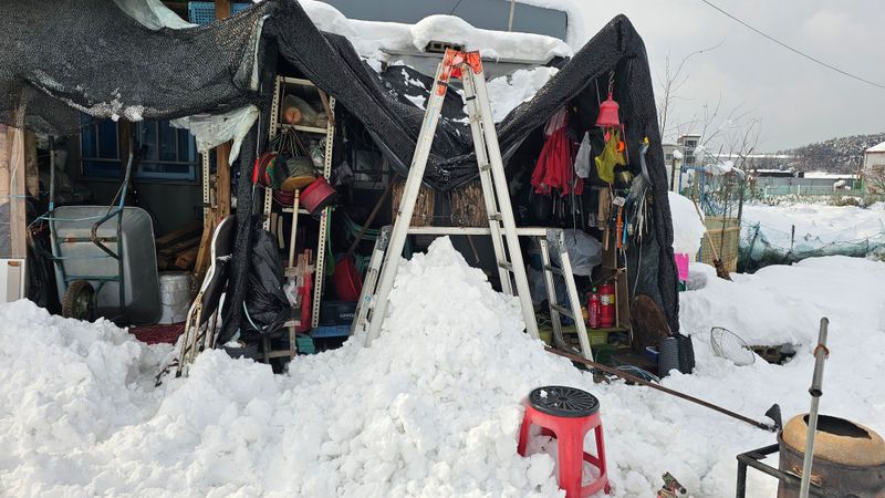 폭설에 농막이 폭삭 주져앉았어요~~ 친구도움으로 조금 세웠는데 잘 안되네요~~ 다시 철거하고 재건축 해야 되나봐요~~헐~~~~
