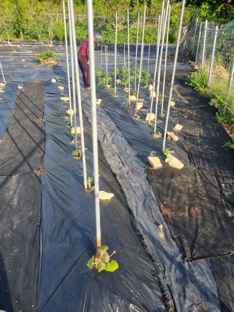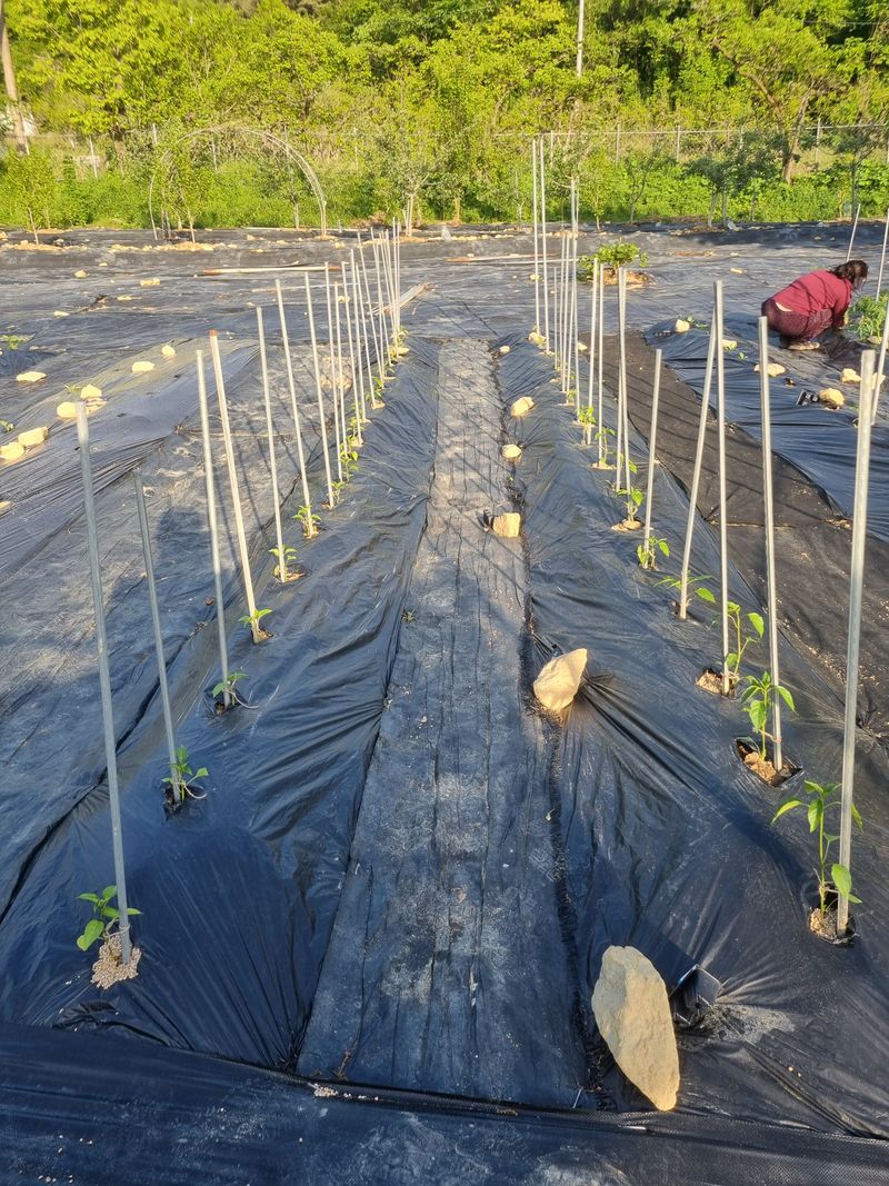 지난주 거름주고 오늘 두둑하고 참깨 비닐쉬우고 참깨 심기 주변풀뽑기,. 고추.가지.토마토.가지지지대설치