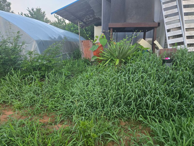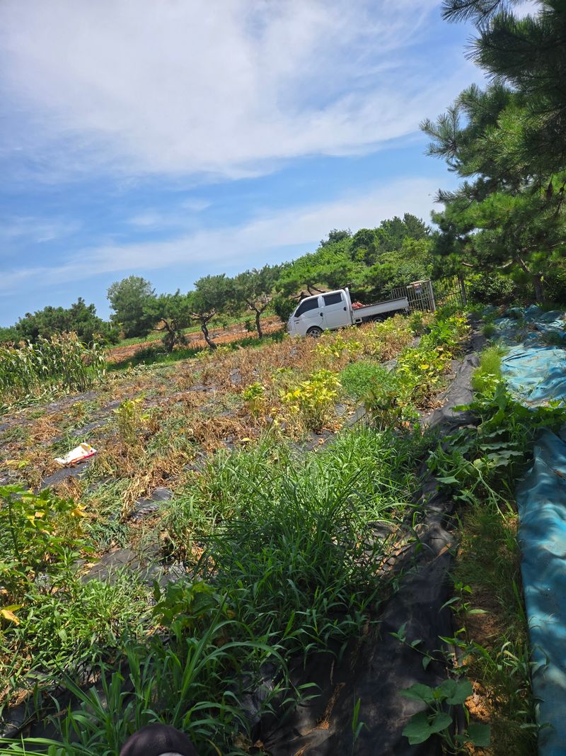 호박밭에풀이많이자라서 큰풀작은풀다제거해야하는데낫으로는시간많이걸리네요조금씩하고있어요