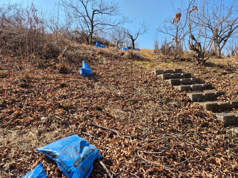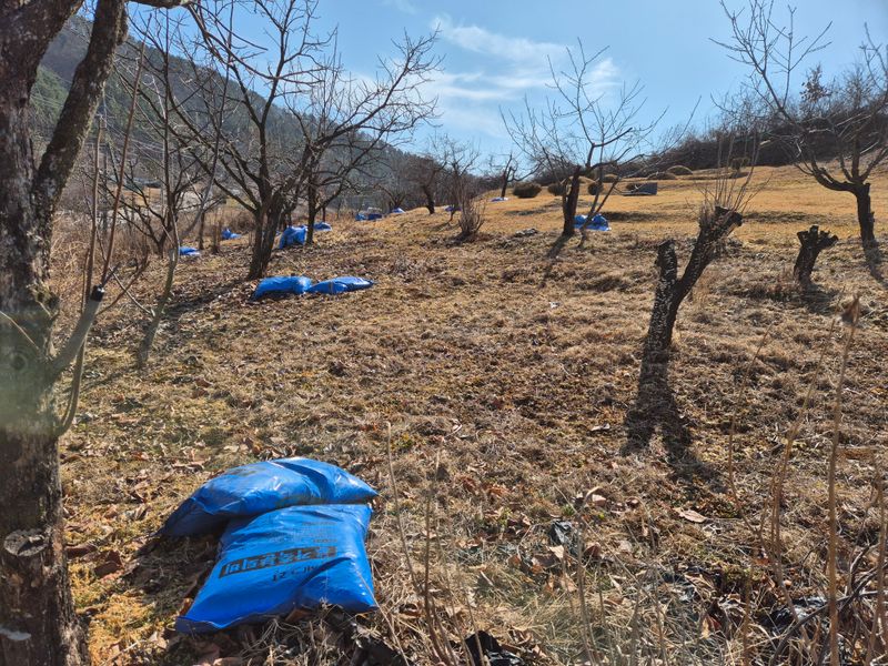 날이 포근 해지면서 감나무 퇴비와 나무비료 쥐습니다.비탈 언덕이라서 지개로 2포씩져올렸습니다.힘든하루였네요