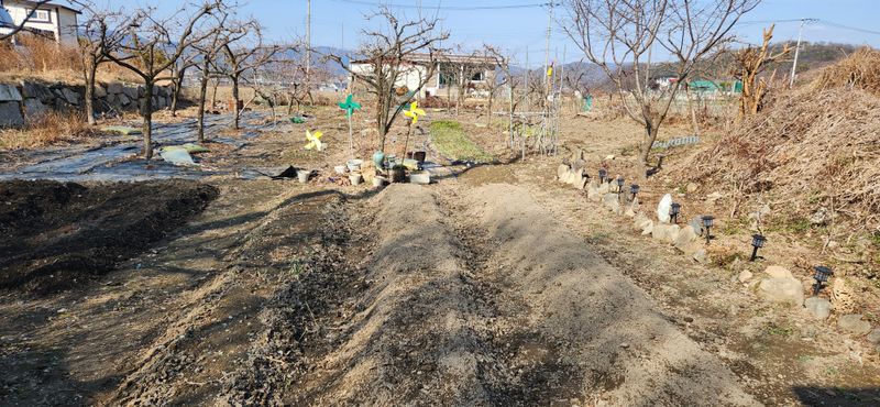 비닐멀칭 배나무5000원 키위15000원 심었음 마늘 양파 물주고 풀 뽑았음