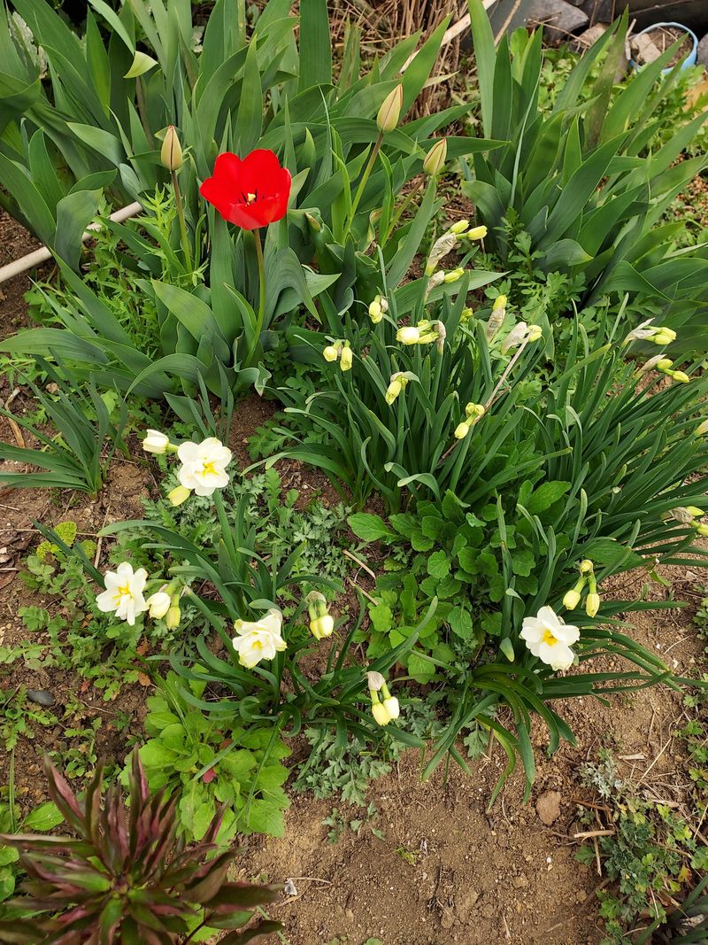 어제는 하우스 내부에 호박그물 설치 점적 관수도 설치 완두콩 파종 하고 휴식 오늘은 마늘밭 녹병 예방 방제 하고 호박그물 치고 하우스대 수정하고 휴식 듀울립꽃에 벗꽃이 저법 피기 시작 하는 하루 랍니다