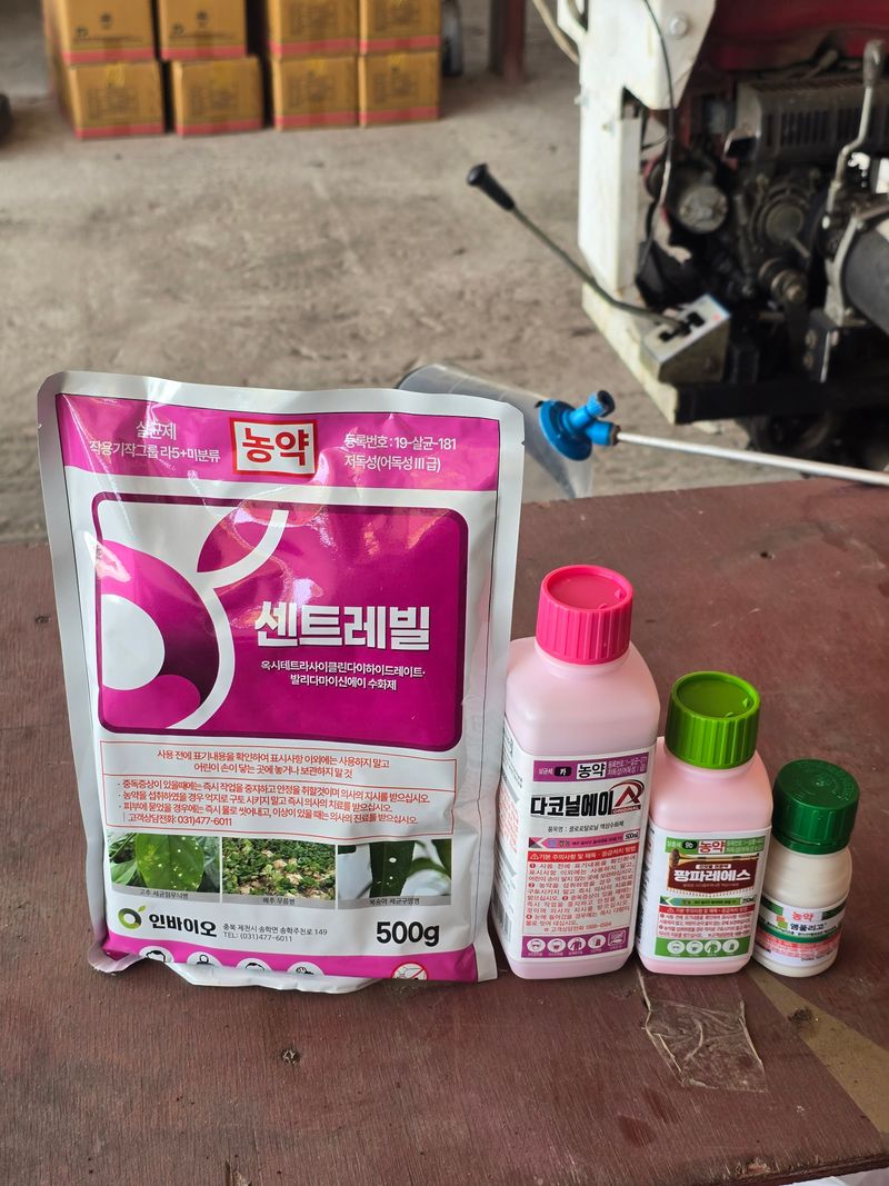 복숭아 소독 -2,000L 다코닐에이스-4병 센트레빌-4봉 앰플리고-4병 팡파레이스-4병 자닮오일-12L