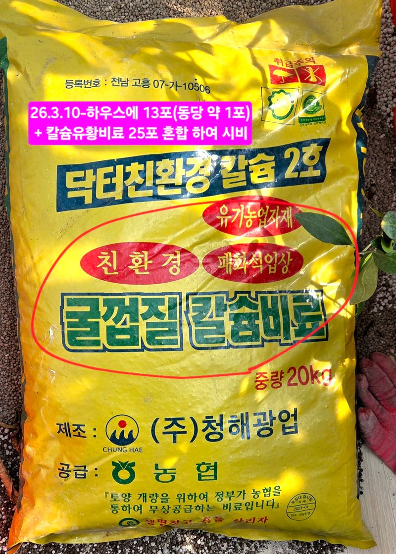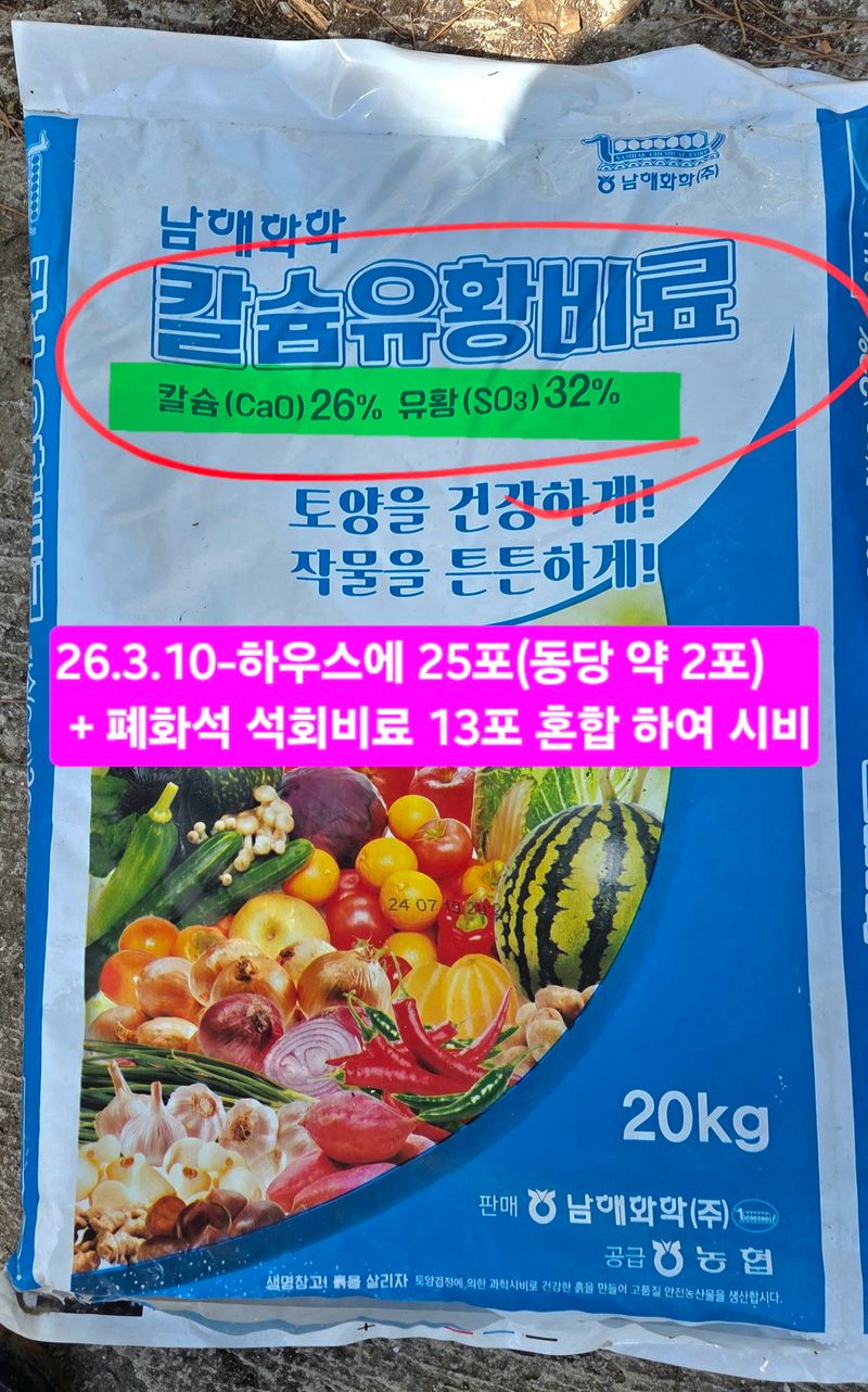 1️⃣wife와 하우스에 토양개량용 칼슘유황비료 25포+폐화석 석회비료 13포 혼합 충전 운반기로 시비(09;30~12;30)