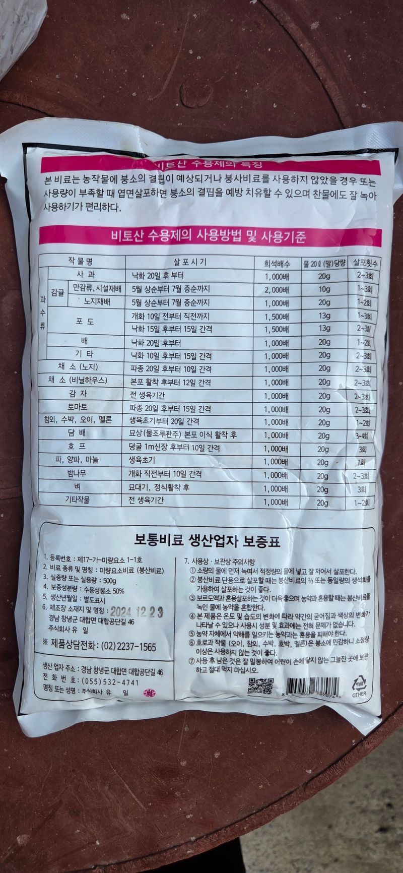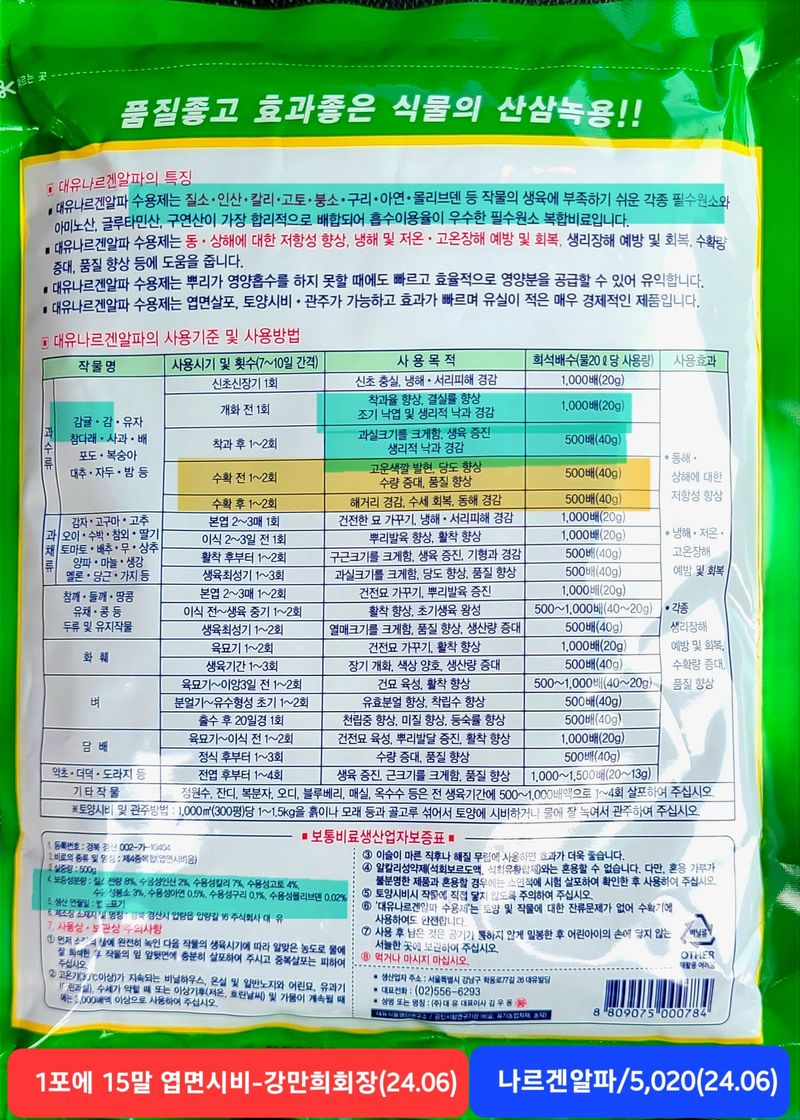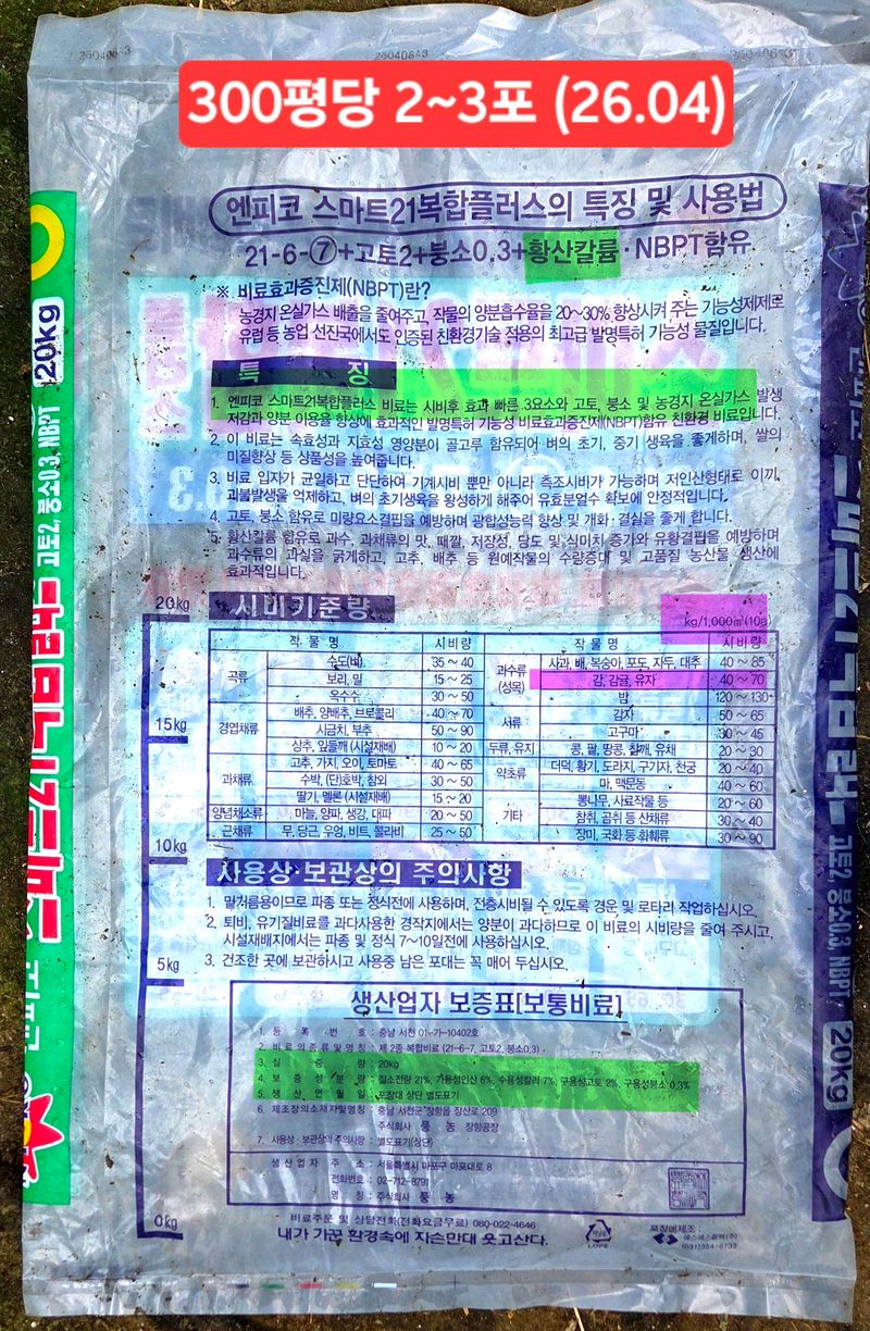 1️⃣농협 홍로지점에서 1)요소비료 5포×17,600 =88,000 2)스마트복비 5포×15,850 =79,250 3)황산고토 20kg 2포 13,390×2=26,780 4)황산아연 1.25kg×2포=4,330=8,660 구입