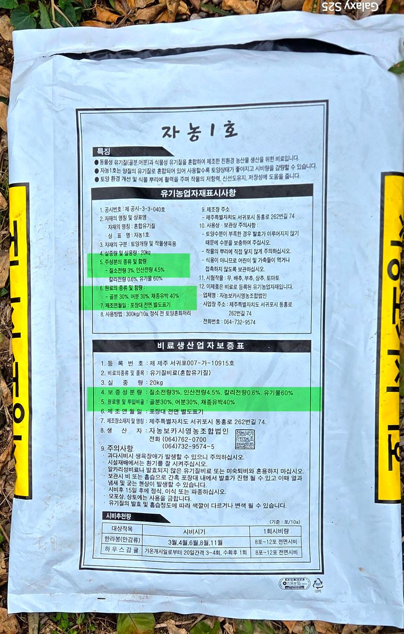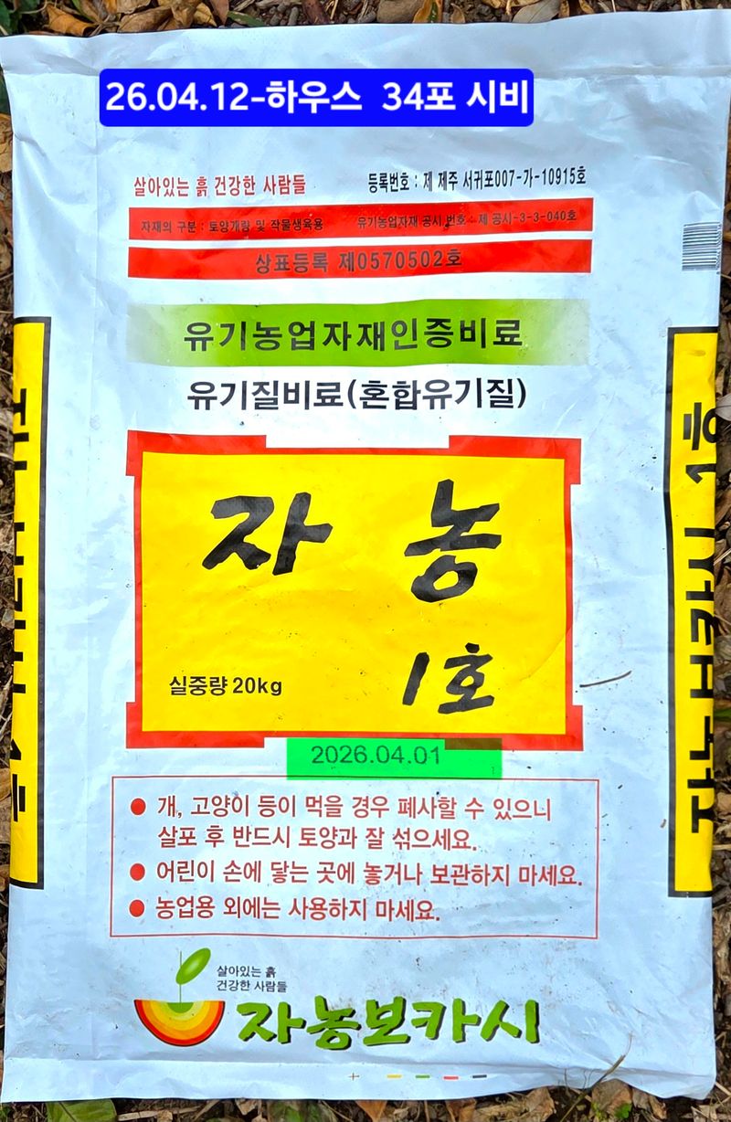 1️⃣하우스에 자농(보카시) 1호(3+4.5+0.6 /골분 30+어분 30 +채종유박 40%)34포 wife와 시비 후 4개동씩 아래로 약 3~40분씩 물주기 2️⃣우영팟에 자농(보카시) 1호(3+4.5+0.6 /골분 30+어분 30 +채종유박 40%) 5포 시비
