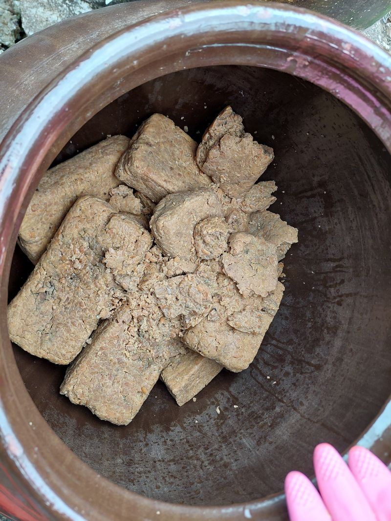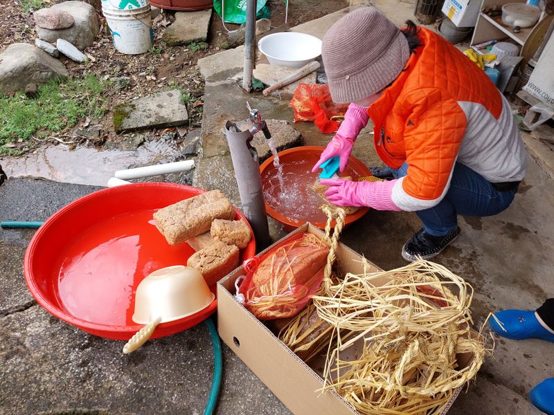 정월장맛이 최고 바람없는 고요한 말(午) 어머님의 코치로 메주 11조각을 깨끗이 씻고 채판에 올려둔 소금에 깨끗한 물을 부어 서서히 녹이면서 바닷물 짜기가 될 때까지 물을 부었습니다. 마지막으로 대추와 고추 및 숯을 넣었습니다. 올해도 노란 맛난 된장이 되길 기원했습니...