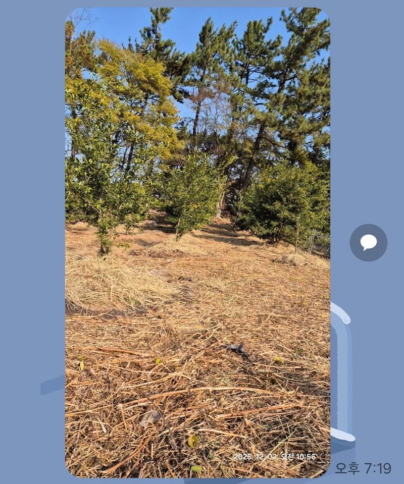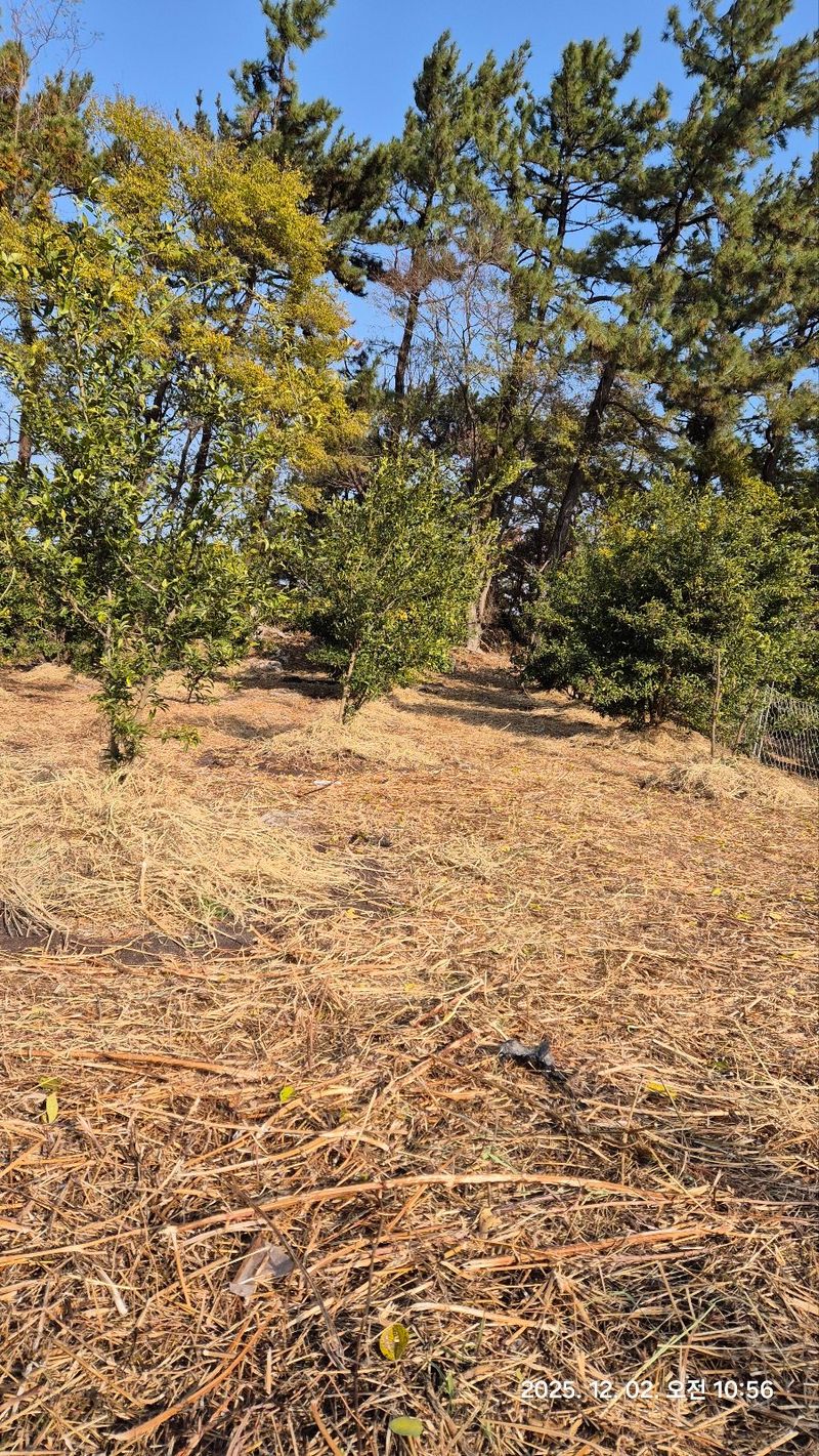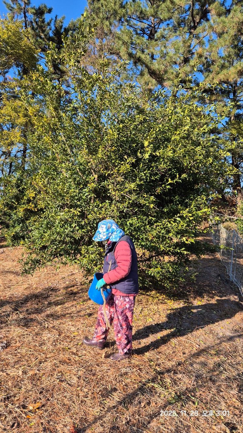 유자나무 밑에. 벼짚 깔아 주워습니디