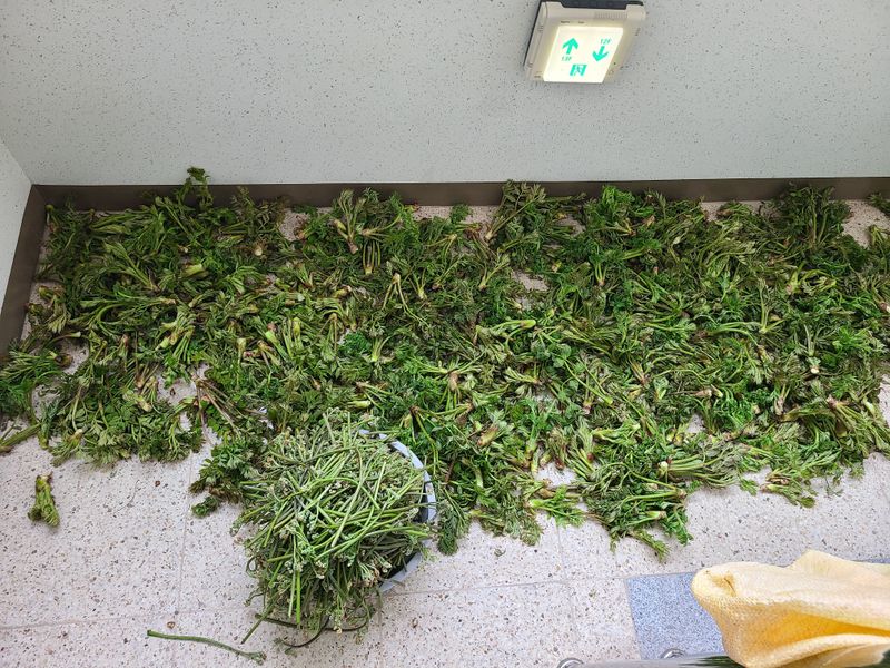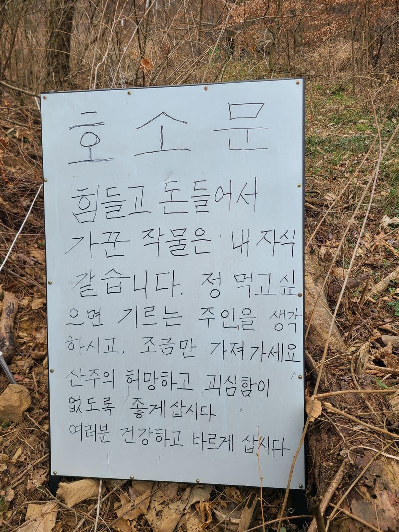두릅이 아직 녹색이 않나는 데도 비닐봉 200장 사서 쒸우기 시작했어요 손을 많이 타서 호소문 써서 세워 두었습니다