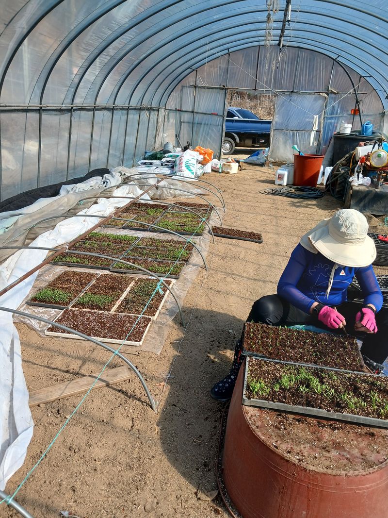고추 어린묘 방에서 촉을네서 비닐하우스로 이동 설치했음