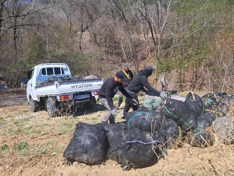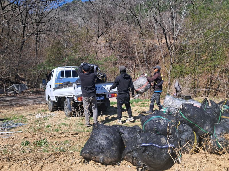 폐 비닐 수거 소각장 반출. 계절 근로자 5명 .오후 비 (휴무)