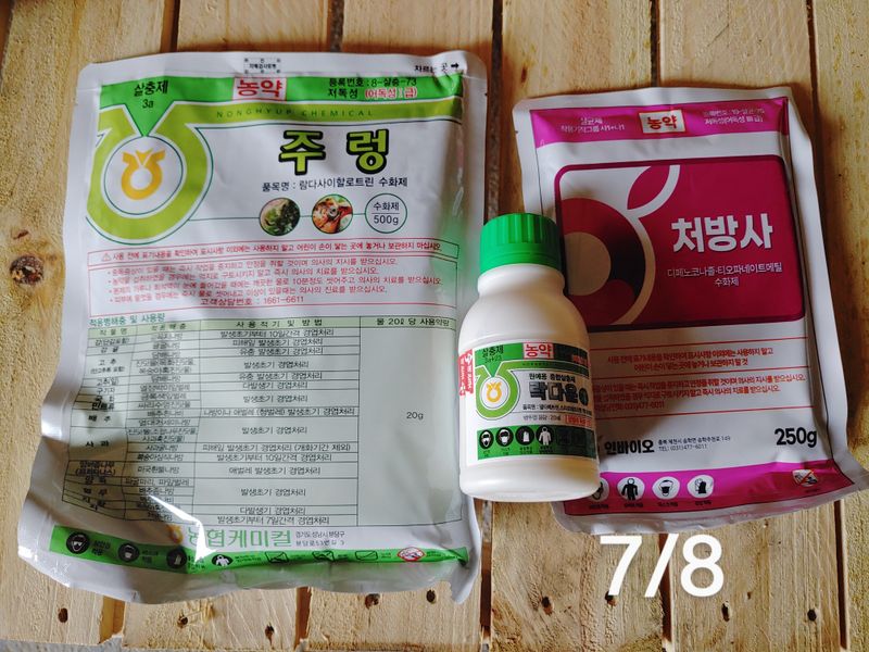 방제 기술센터에서는 용수 산도 측정을 해주지 않는다함. 빙초산 80ml정도 추가. 웃자람 현상으로 인산칼륨 1kg/500L 첨가하여 방제