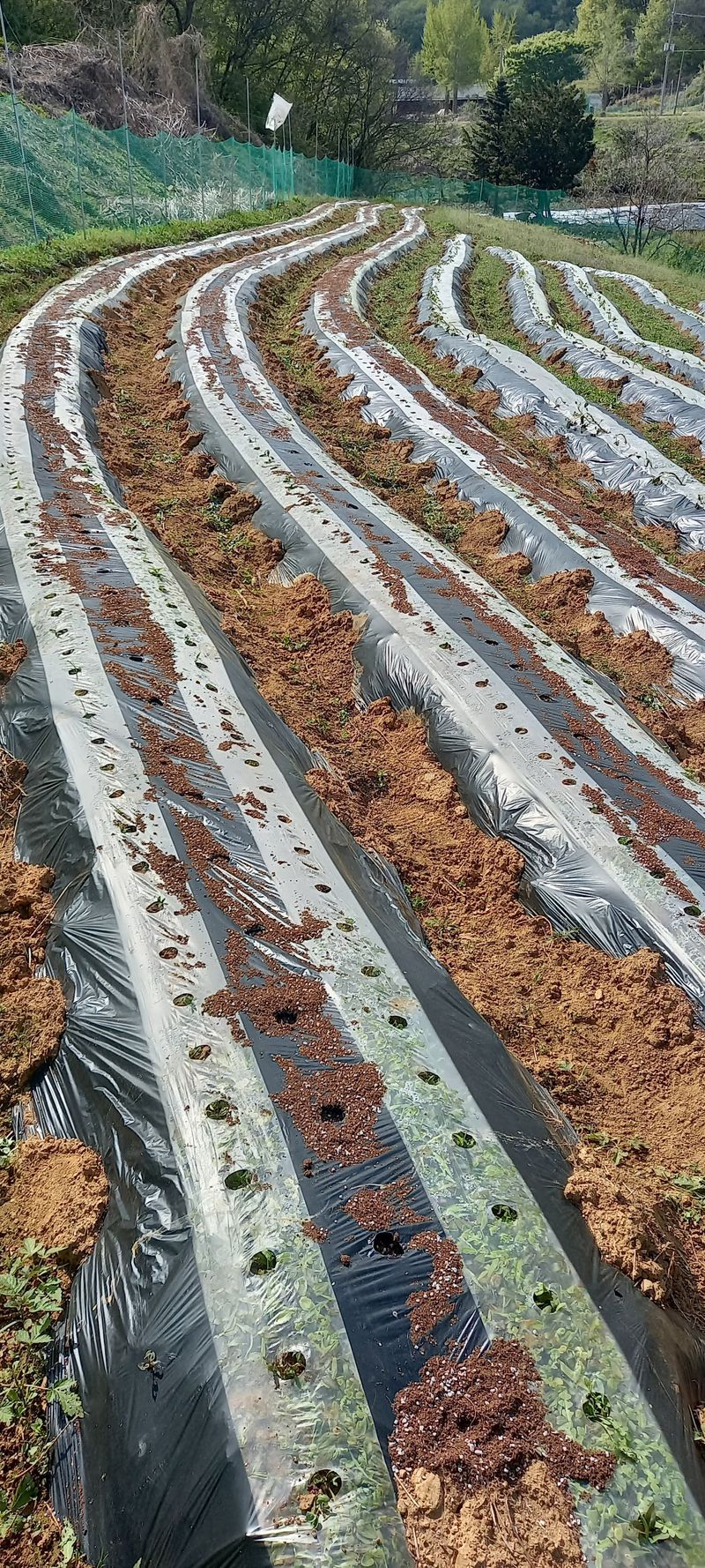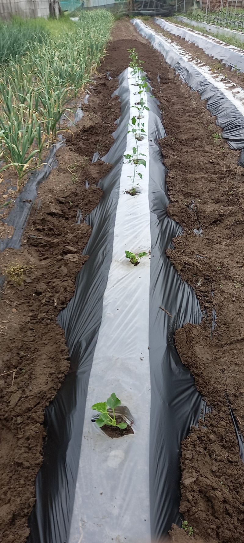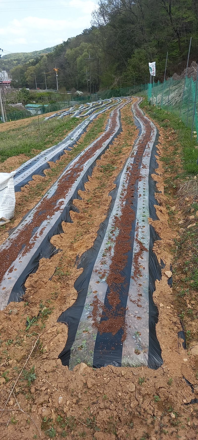 밭자리 빈공간에 두둑만들고 비닐씌워서 꽈리고추와 참외모종 심었어요 비가 오니까 잘 살겠죠