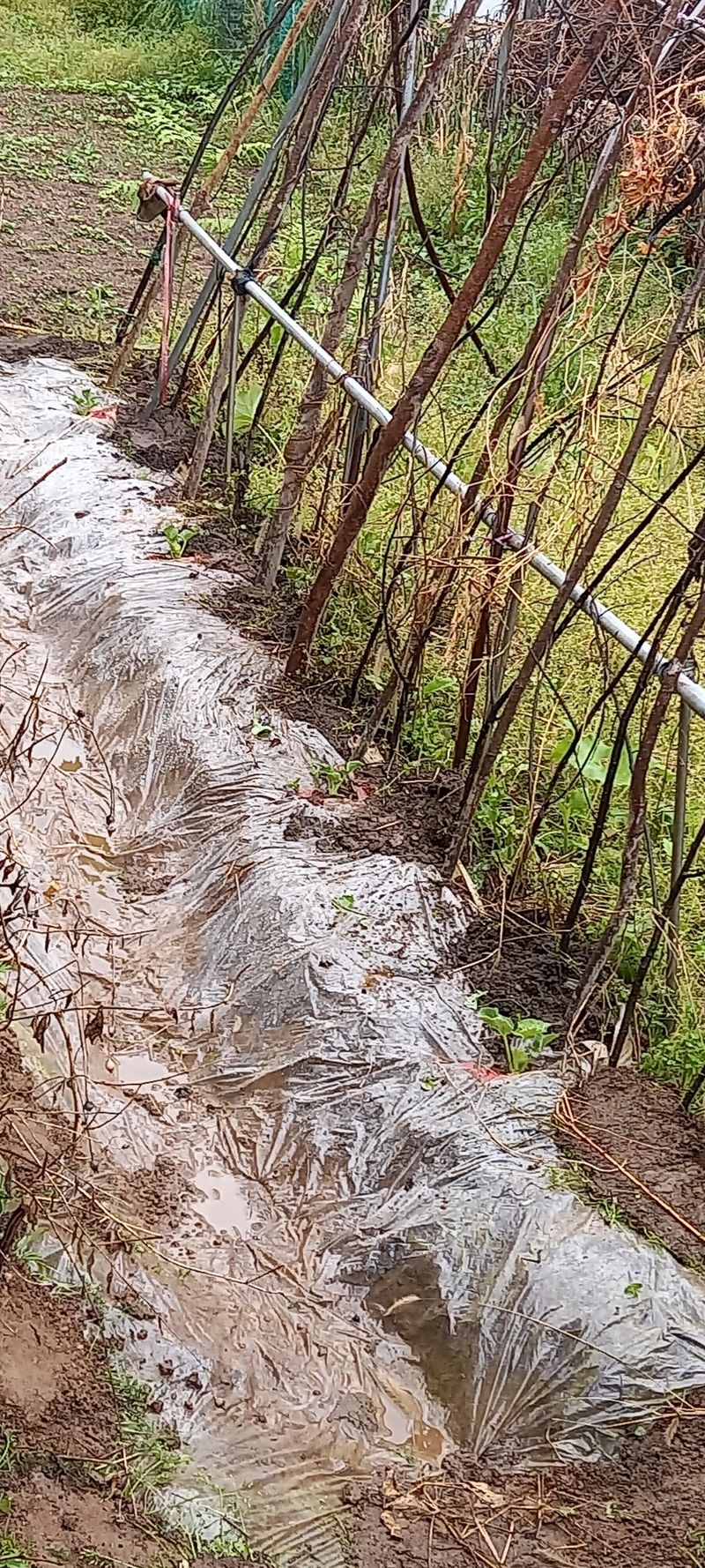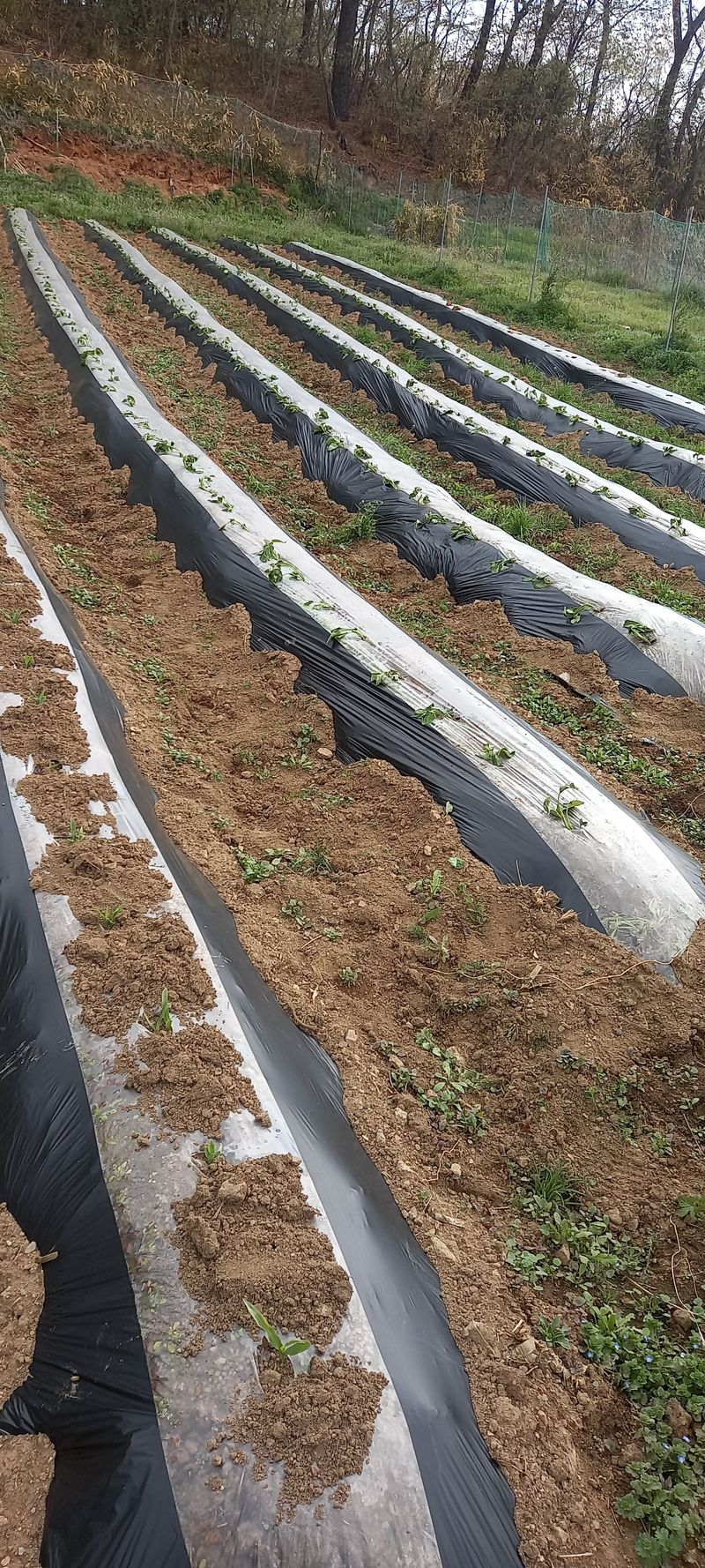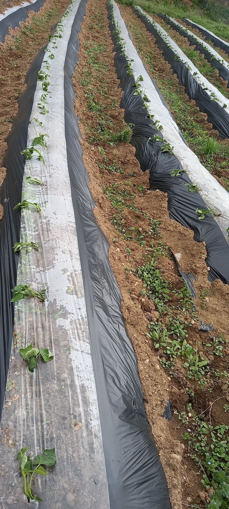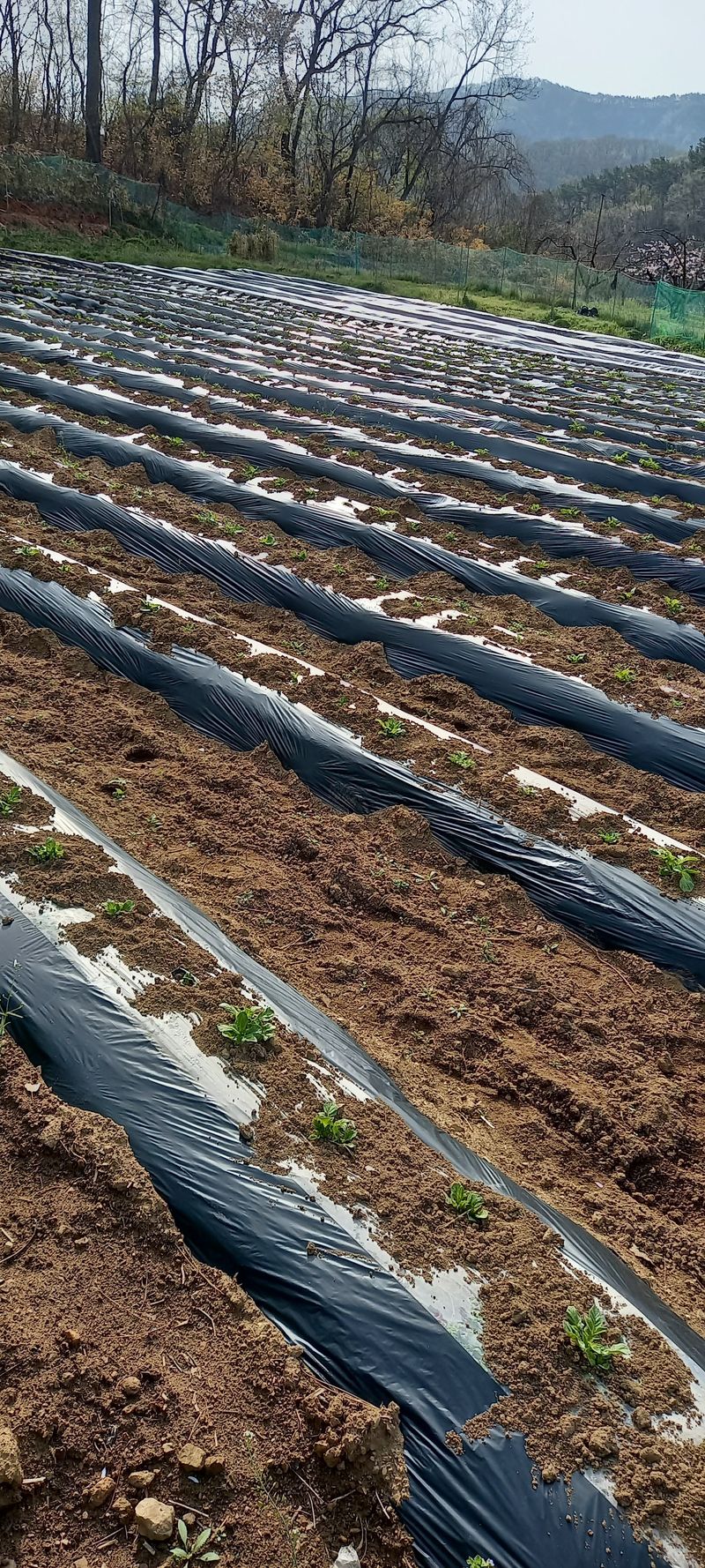 밭자리 빈공간에 두둑만들고 비닐씌워서 꽈리고추와 참외모종 심었어요 비가 오니까 잘 살겠죠