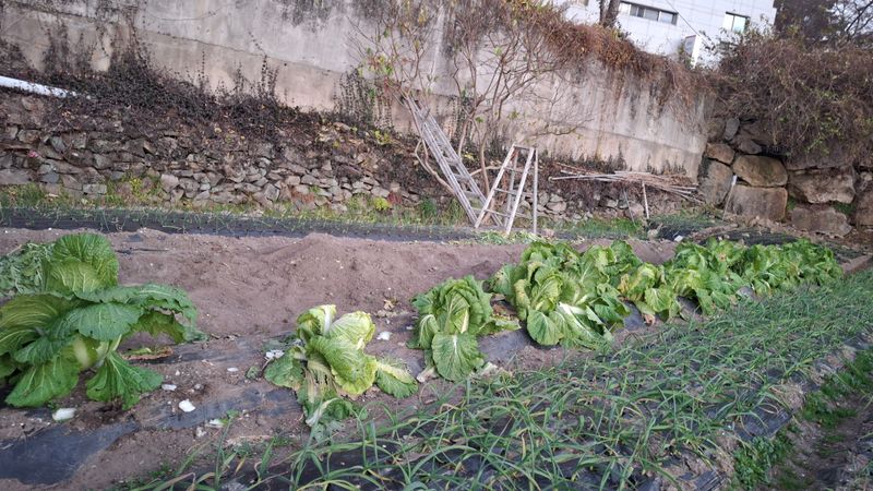 무우 땅속에 묻고 배추 뽑아 김장준비하고 있습니다