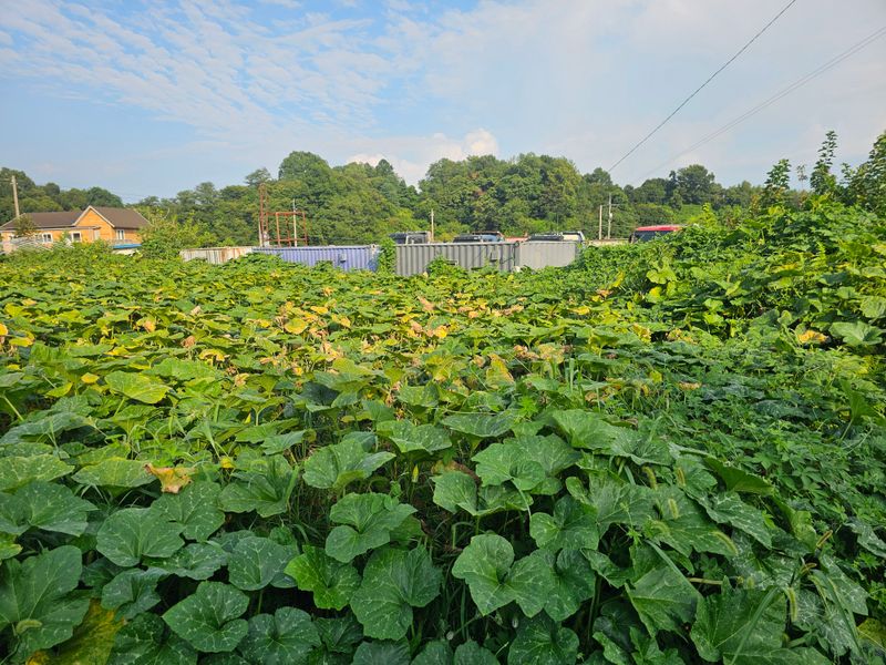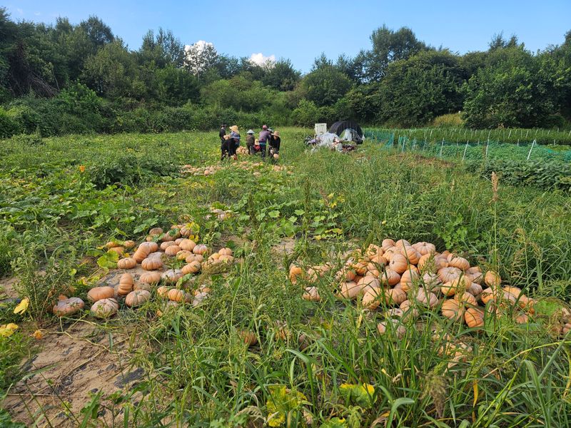 누렇게 익은 멧돌호박 수확하였습니다. 아직까지 순이 너무좋은데 얼마나 나올지 ᆢ 늙은호박 수매장이나 매입업체 공유 부탁합니다. 재배면적 25,000평입니다