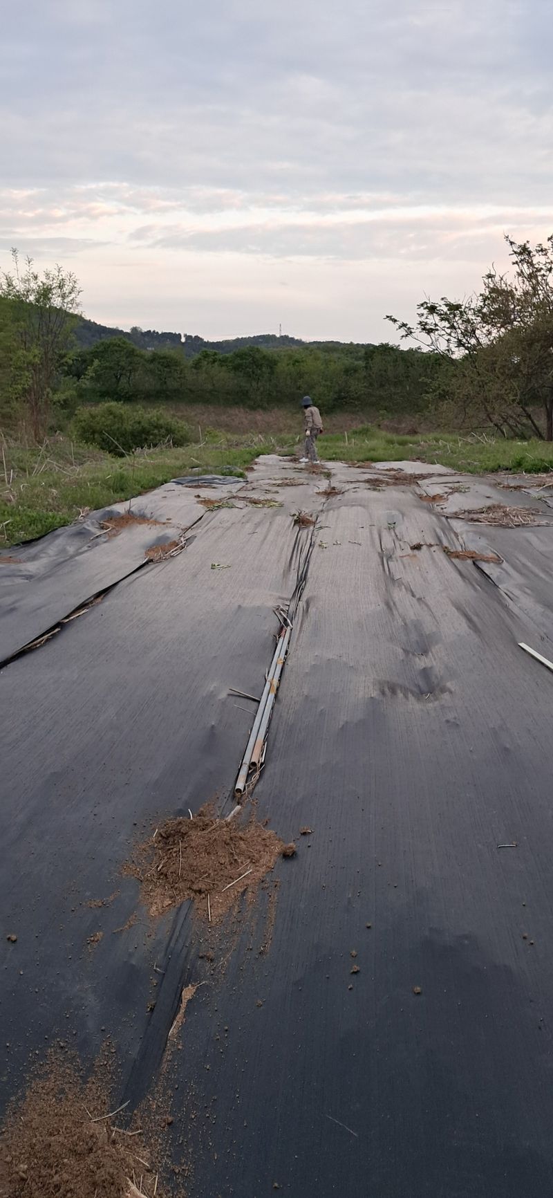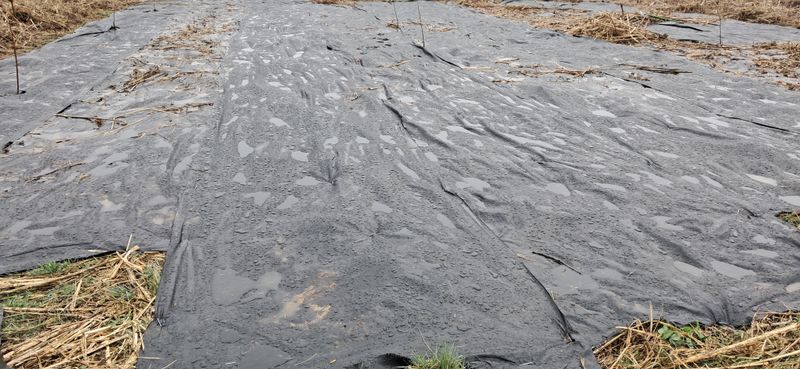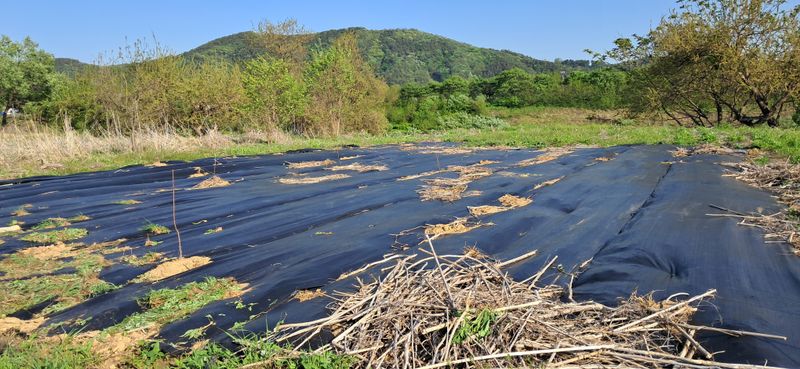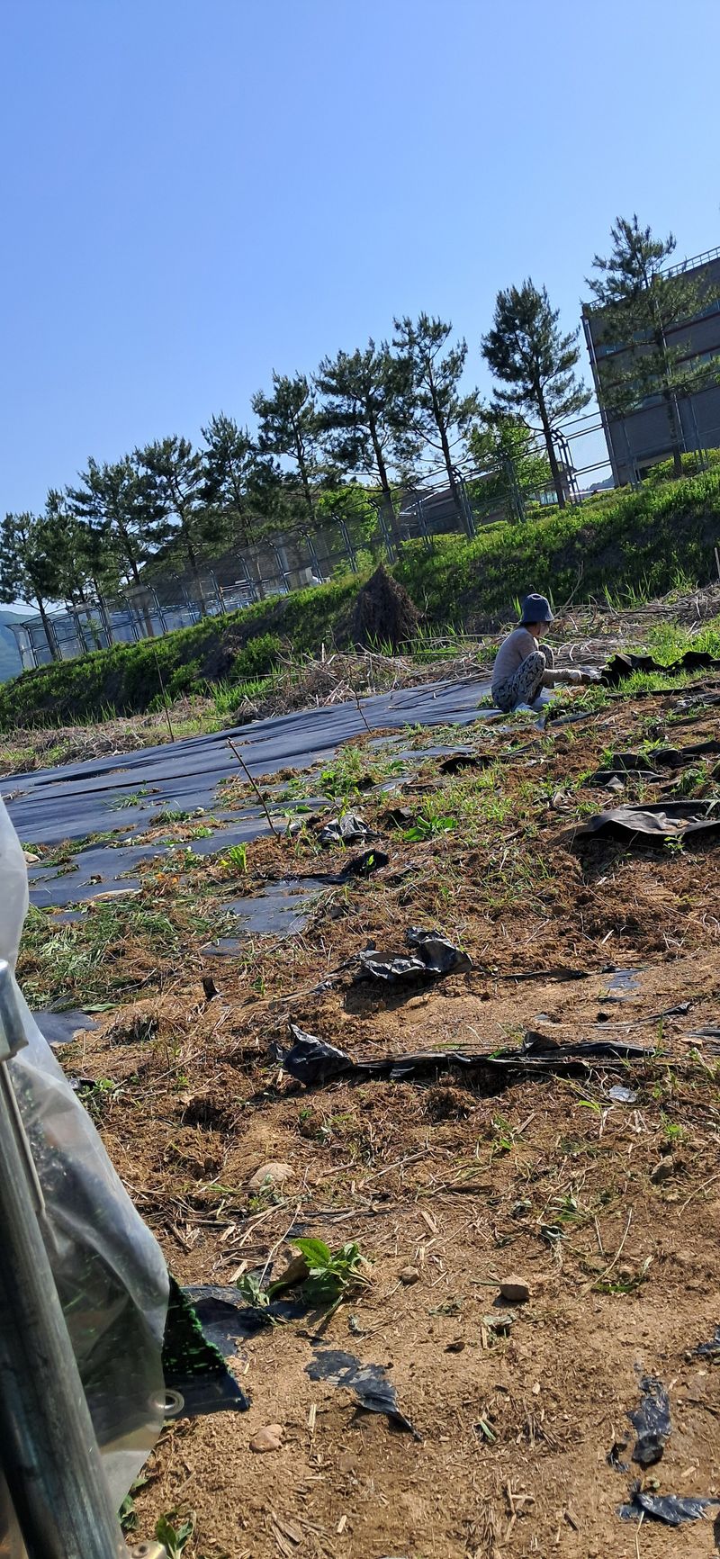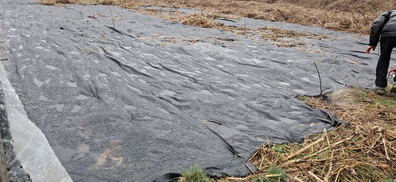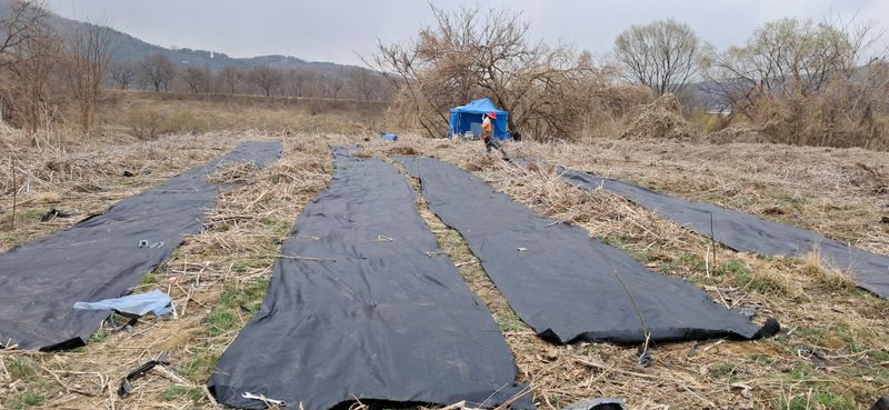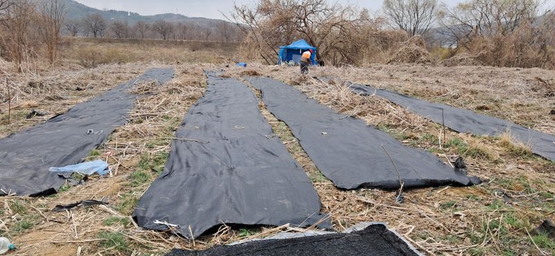 밭 전체에 비닐씌우고 고정핀 꽂움
