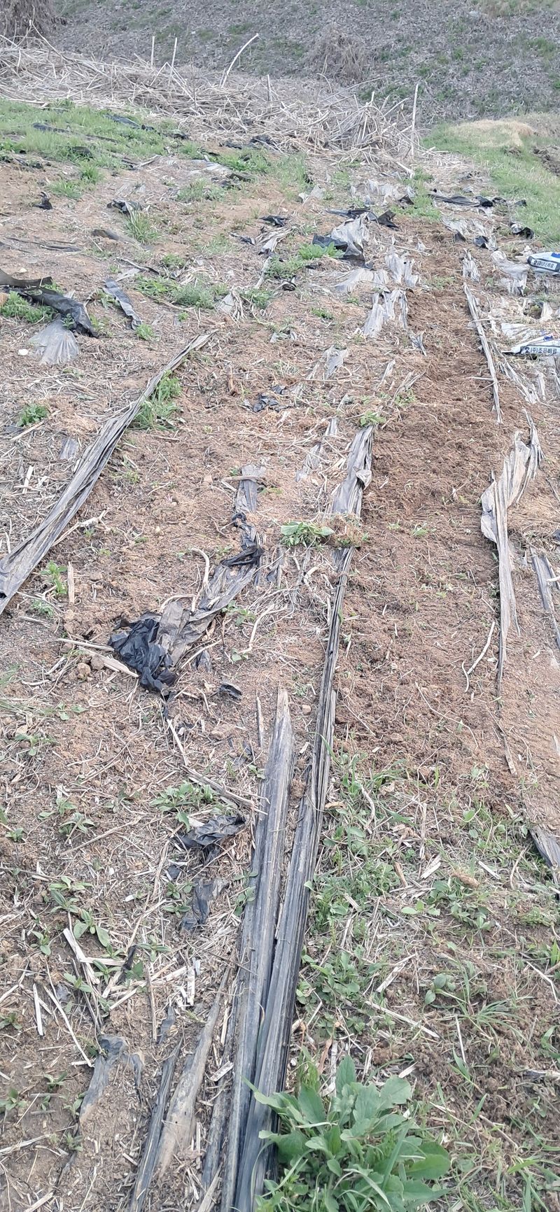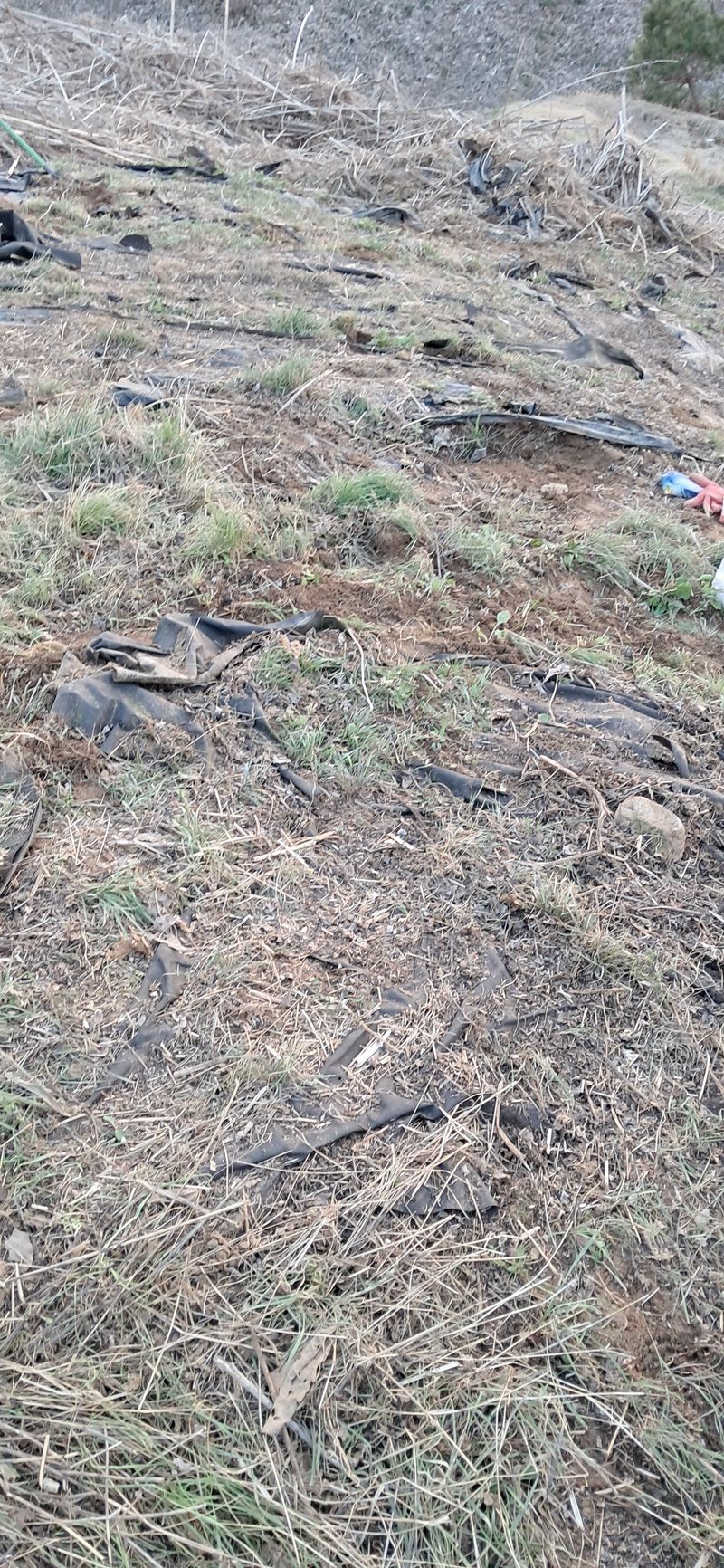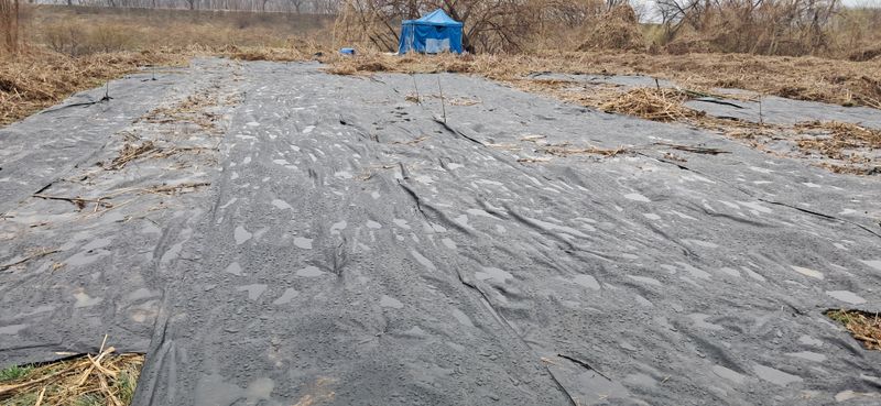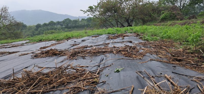 밭 전체에 비닐씌우고 고정핀 꽂움