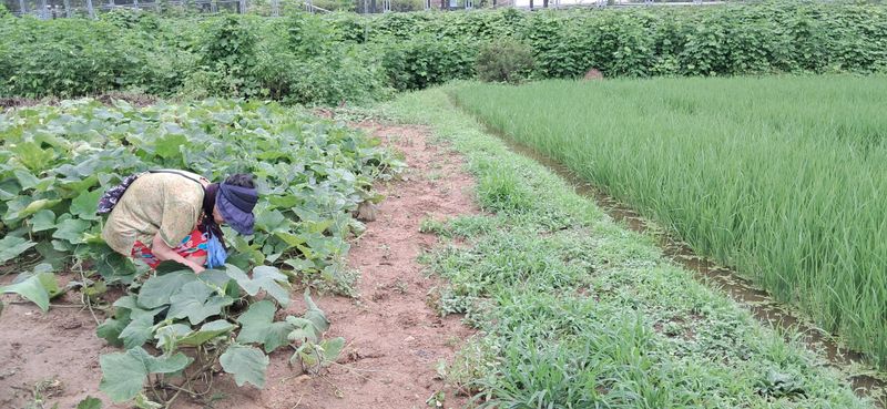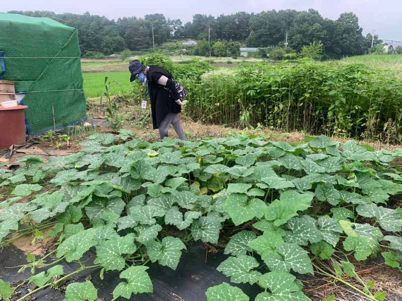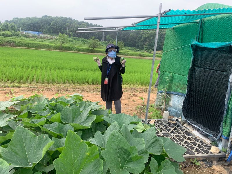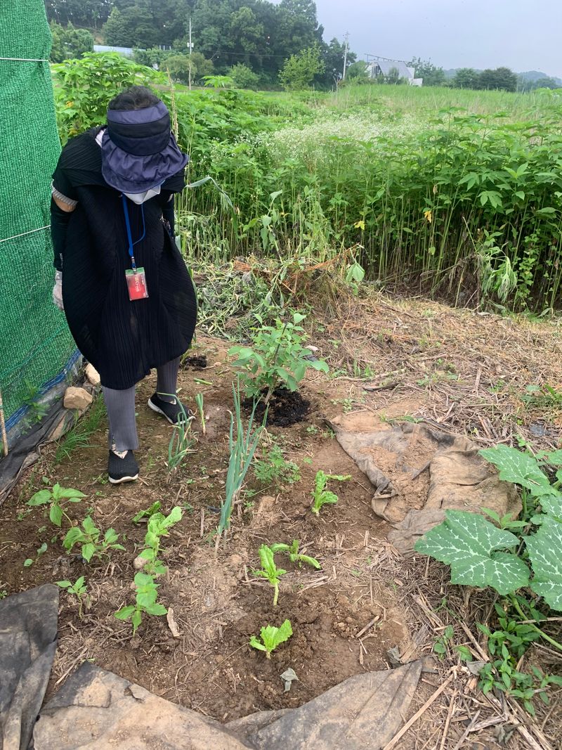 채소[미나리, 호박, 부추,고추,가지, 들깨, 상추 등을 보충심고 풀뽑고 물주기.