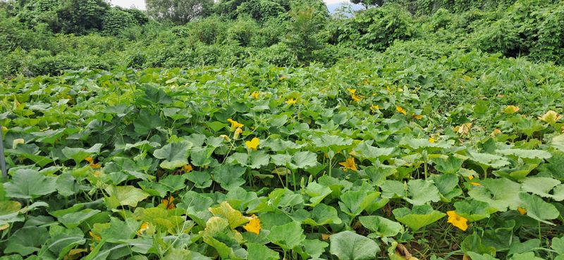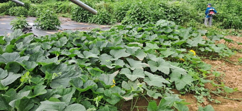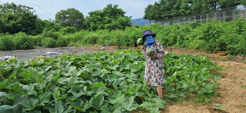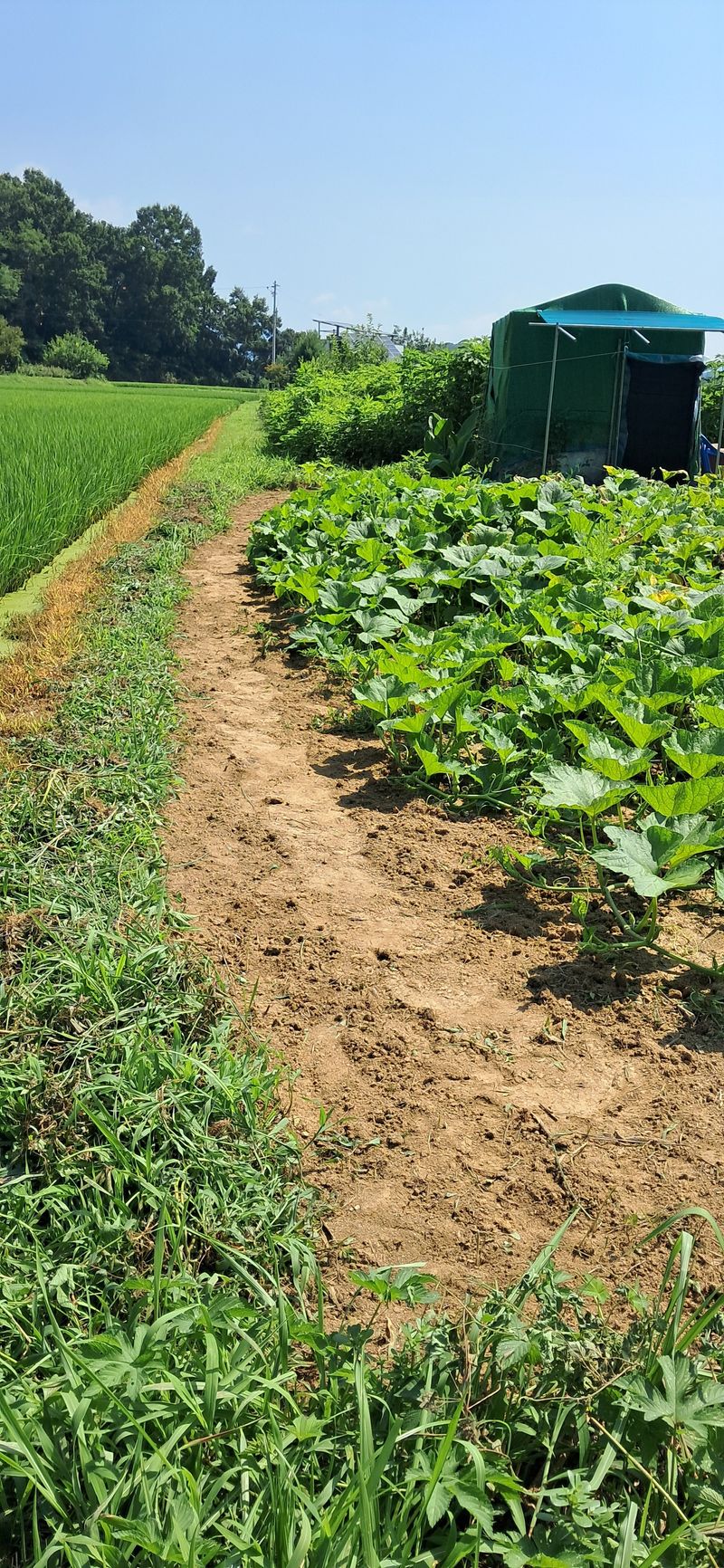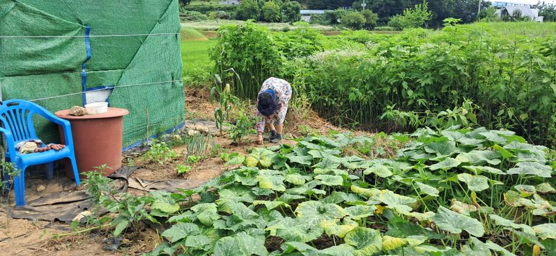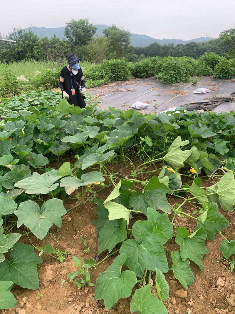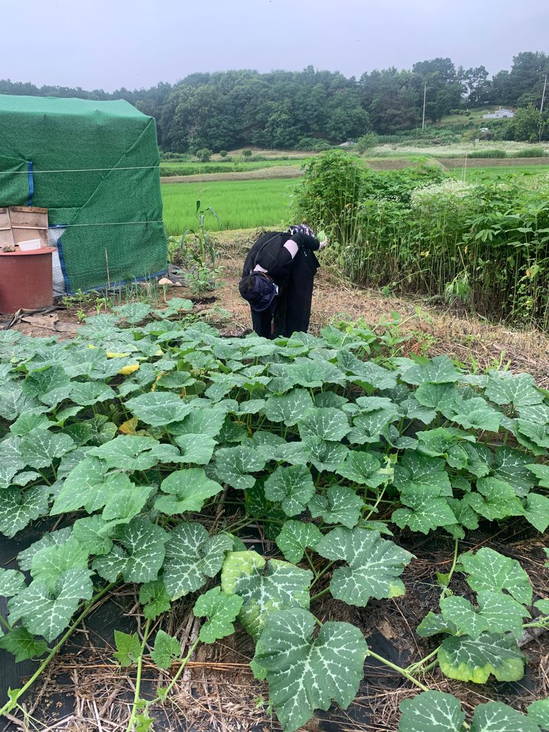 호박, 채소(미나리,머위,옥수수,파, 부추,고추,가지 등 )밭에 풀뽑고 물 줌.