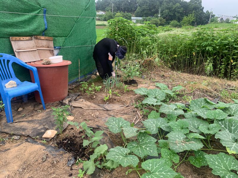 호두1,매실2,가죽2,두릅10,밤17,대추15그루 심어놓고 지극정성 돌보며,채소[옥수수,가지,고추,여러 가지 콩,단호박,둥근호박,미나리,부추,머위,참,취,둘,달래]등을 심고 김매기.