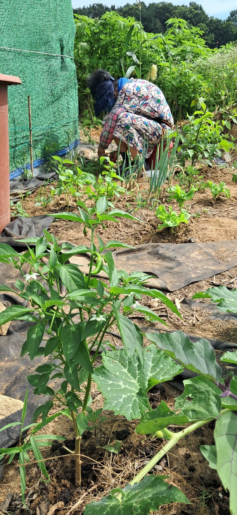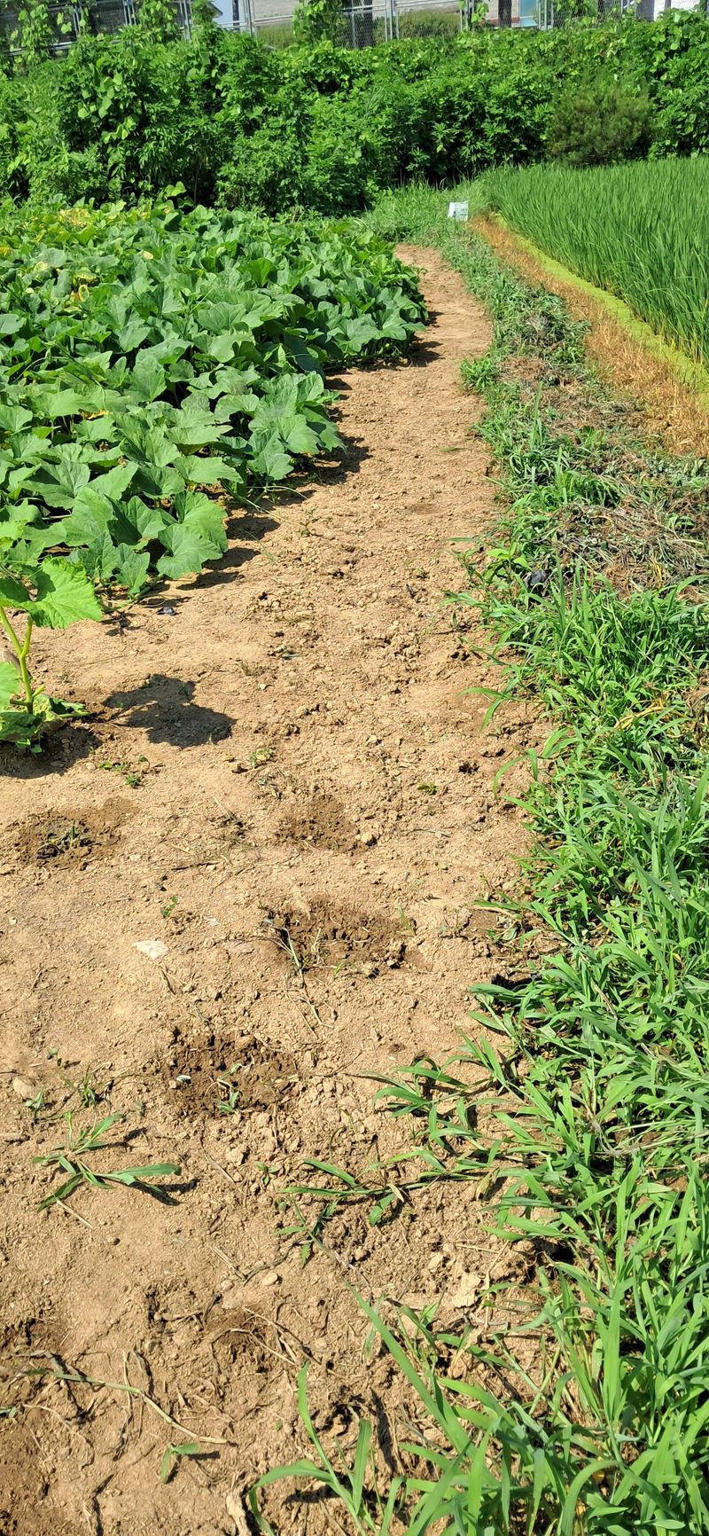 호박, 고추, 가지, 부추, 미나리, 들깨 등을 보충 심고 물주고 풀 뽑음.