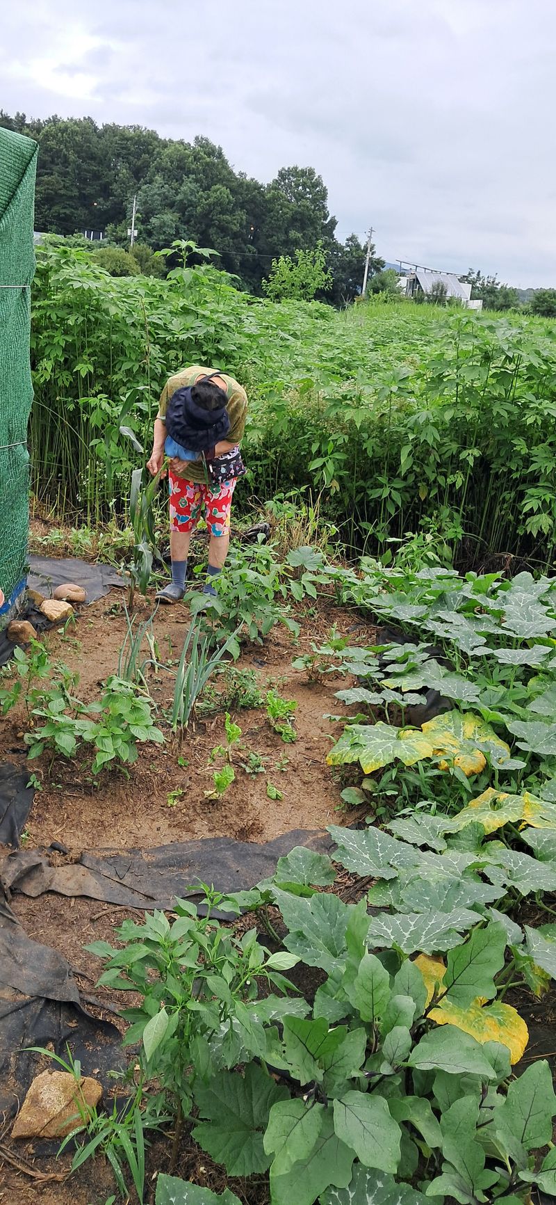 채소 밭에 풀뽑고[밭미나리,단호 박,대파,상추 등]보충해서 심고 물 주고.애호각 땀.