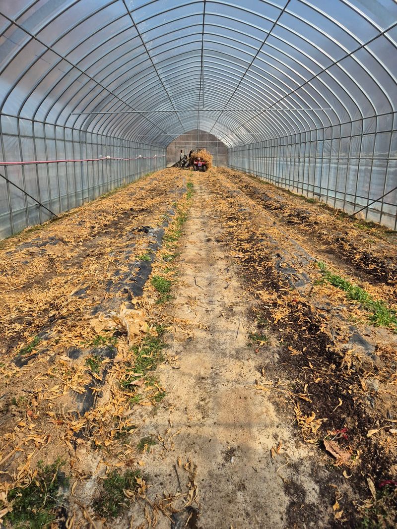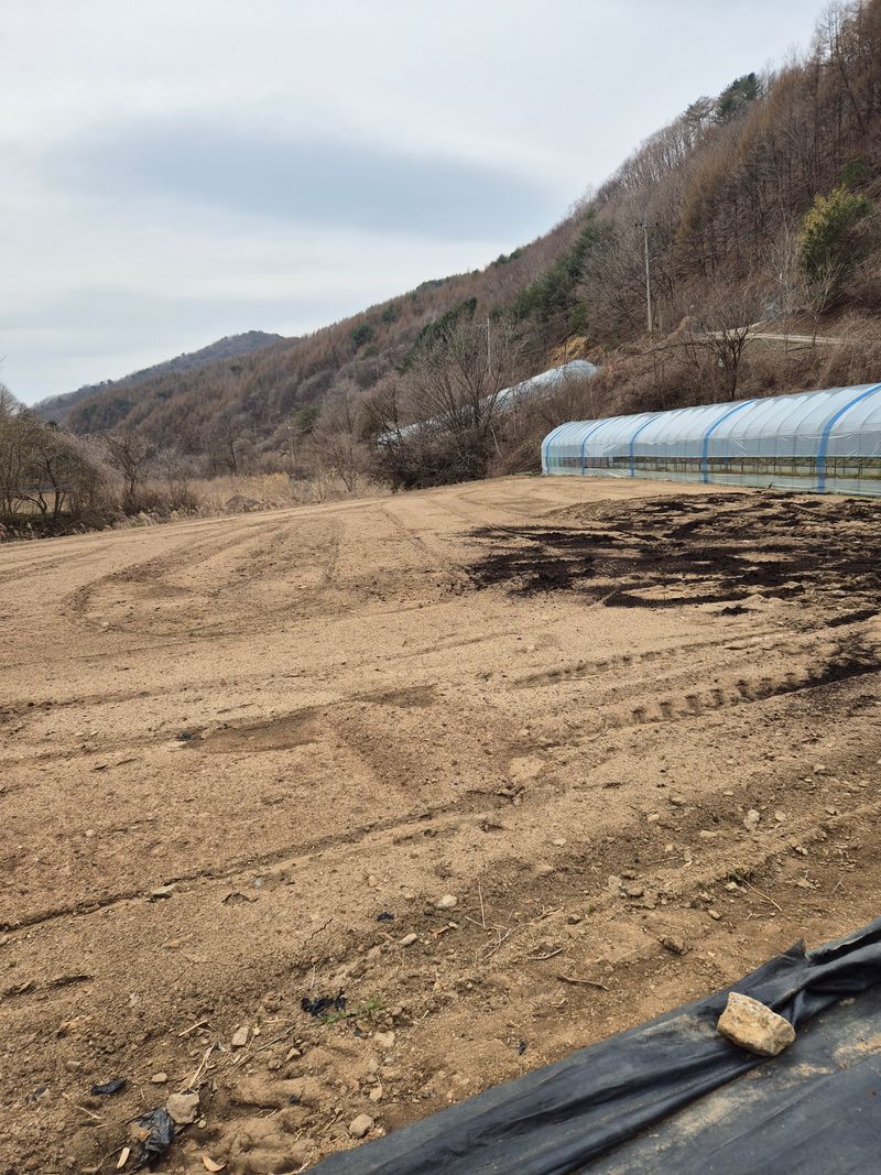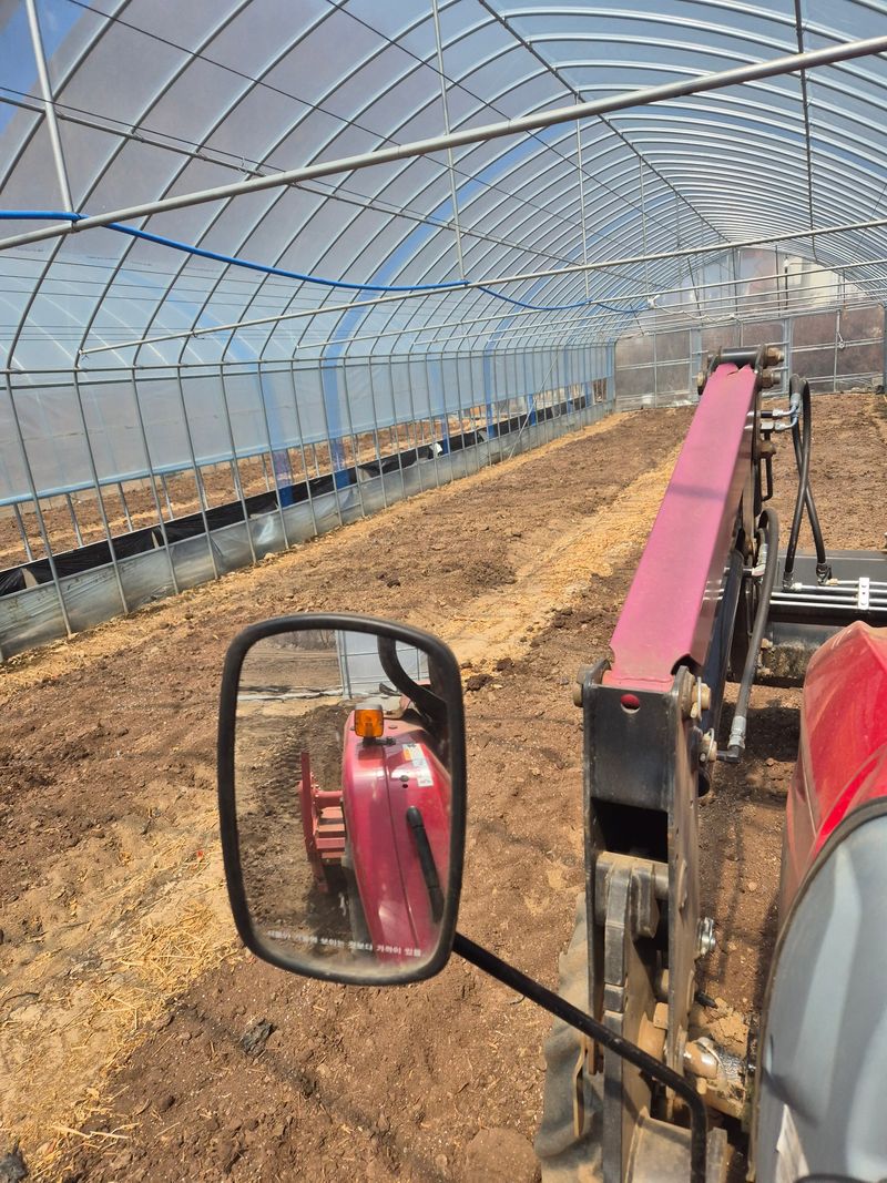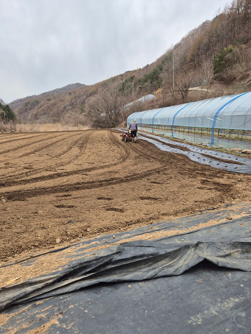 오늘도 고추밭 하우스를 깔아놓았습니다 거름과 비료를 뿌리고 2회 갈아놓았습니다
