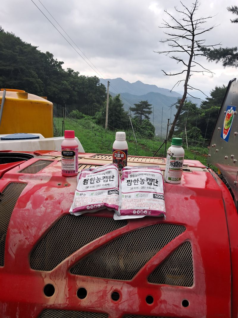 농약살포 베프란+캡탄+가네마이트+고칼슘 +빙초산2잔물1000리터ss기로살포 1105+1104번지 제초작업1105번지