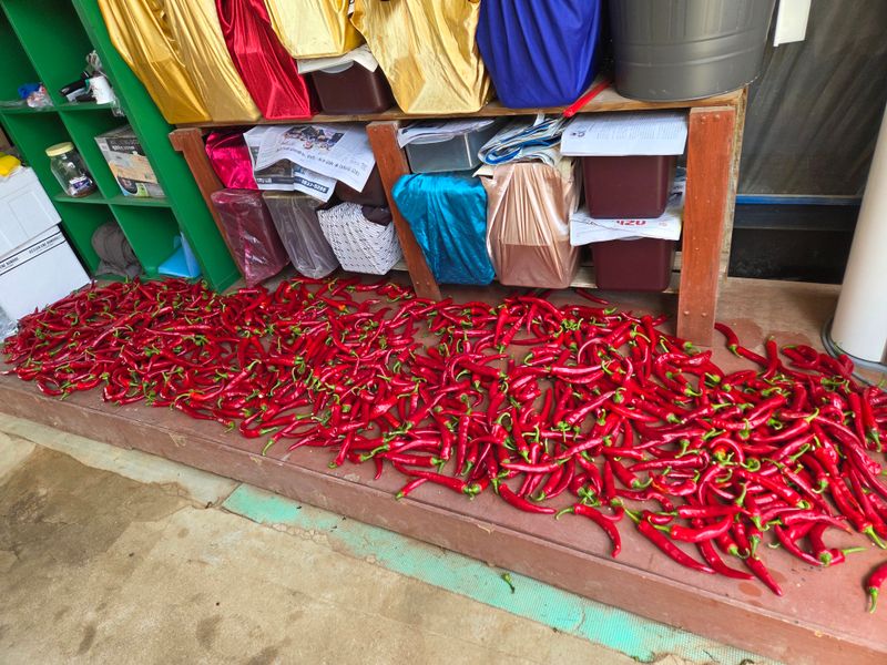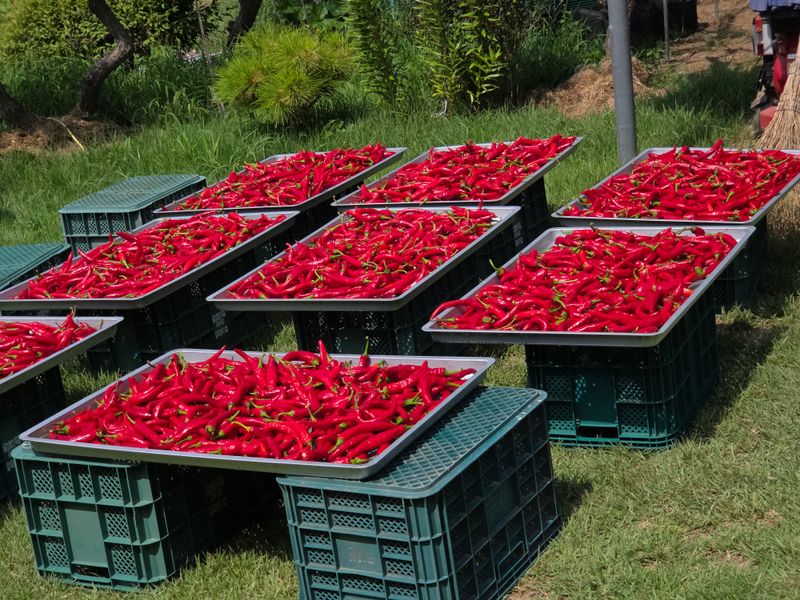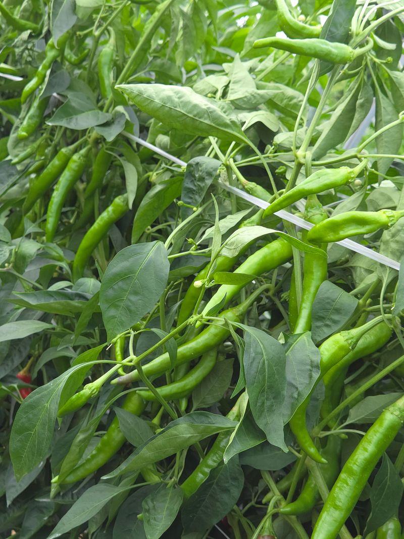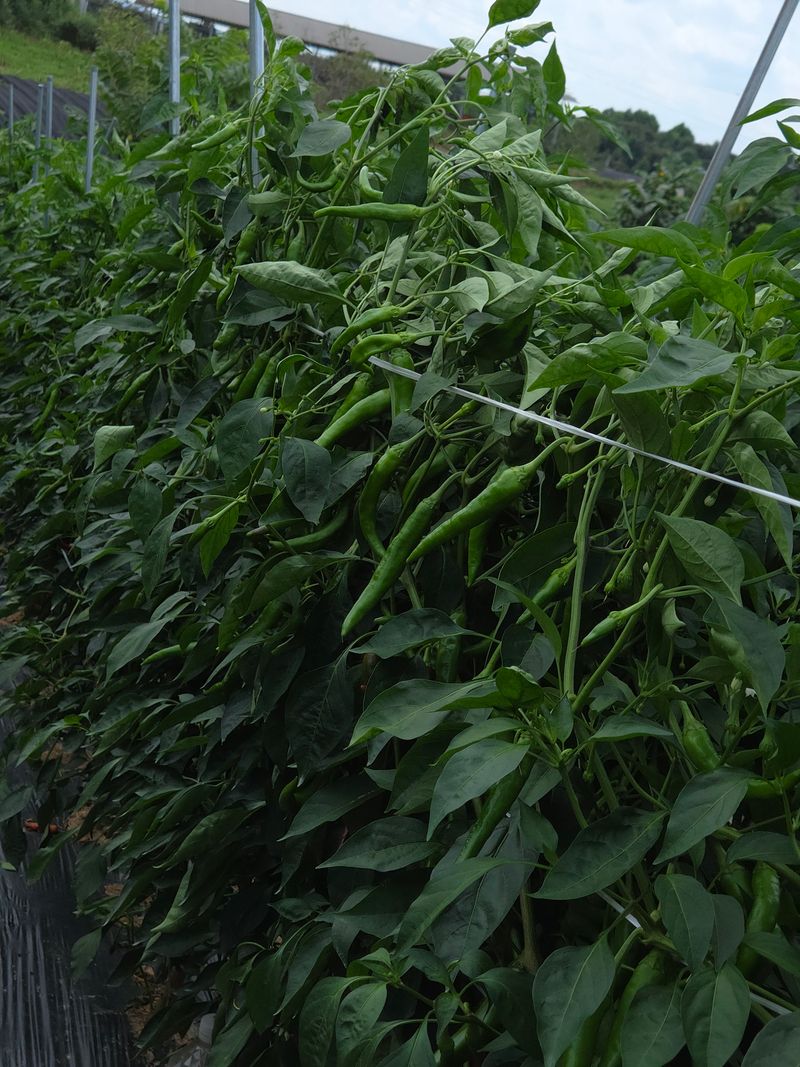 고추수확 노지고추가 160센치로 계속크고 있으며 지금도 꽃이피고 고추가 달리고 있어 또 줄을매줄 예정임ㆍ농약은 규산황등 유기농약 ㆍ비료는 고추특호 ㆍ염화칼슘을 각1키로씩 녹여서 기술센타보급 미생물과 섞어 5일간격 추비개념없이 계속 관주로 주고있음 ㆍ고추는 한골을 혼자 ...