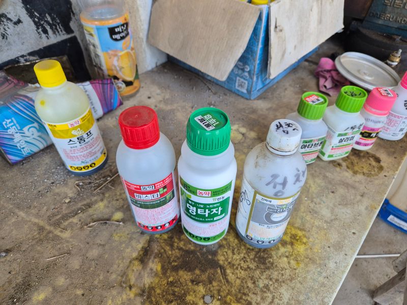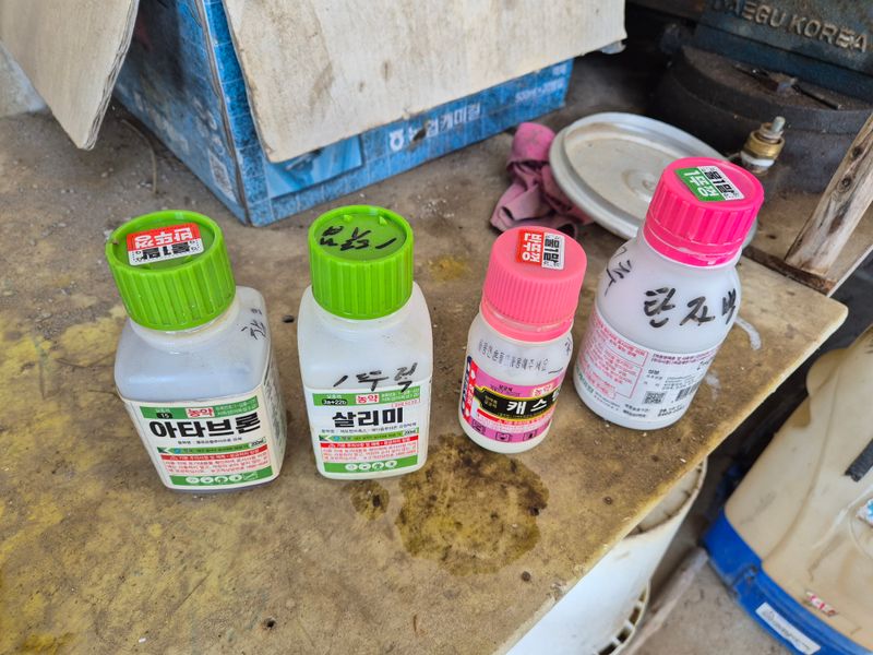 1. 고추말장박기 및 줄띠기 2. 제초제 살포 - 함포 아내논, 처남논 패트병 물 2리터에 2병 좌우에서 뿌림. - 막개논에 패트병 물 2리터에 2병 좌우에서 뿌림. - 막개논두렁에 제초제살포 3. 모판 모성장확인