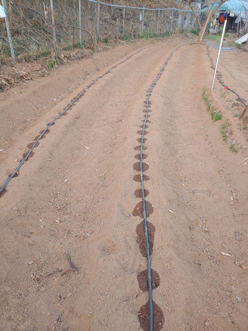 복숭아 사과나무 석회유황 소독 마늘밭 추비 감자밭 점적호스갈고 물주기