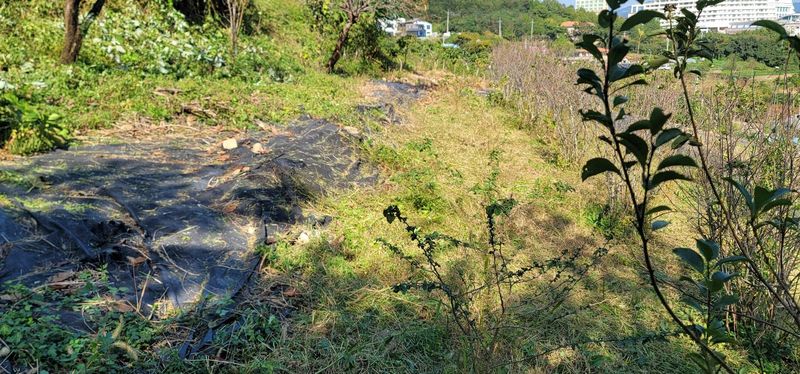 제초매트보수작업 바람에 날려 찢어진곳들 황칠나무1그루 이식작업 유기질비료 뿌려주기 5팩.20킬로×5개