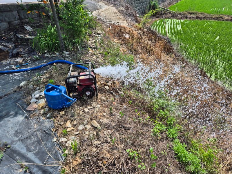 장마는 비도 온듯만듯 지나가고 불볕 더위만 기승을 부리네요. 오늘은 엔진펌프로 벼논에 물 퍼고 있습니다.