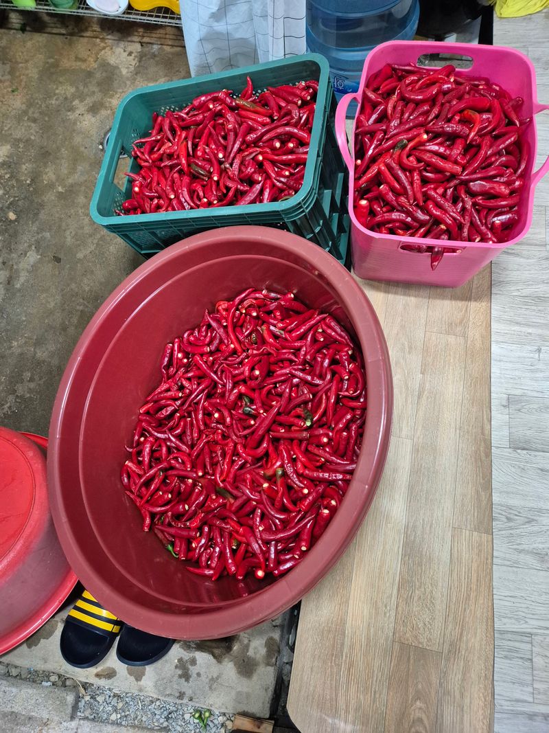 홍고추 5차 수확입니다. 모두싹만 5번 치고도 특이한 병충해는 없는데 고추 크기가 천차만별 이네요. 100포기 심었는데 고추 수확량이 너무 적어요. 5차 수확까지 20근도 안되겠네요.