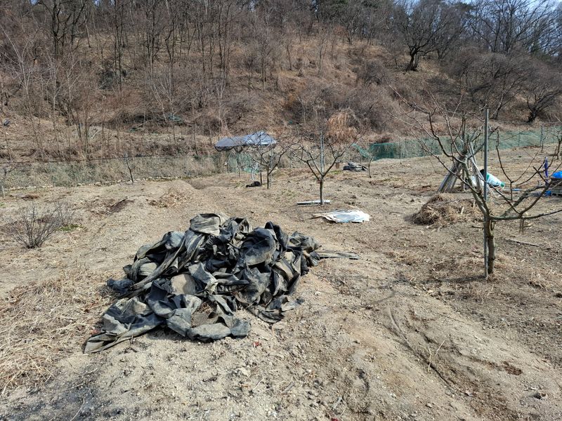 달전리 144, 527 번지 1, 보식한 단감묘목 물주기 2, 망짖기 및 밑거름 살포 (가축퇴비) 10포 200kg 3, 잡초방제용 멀칭작업