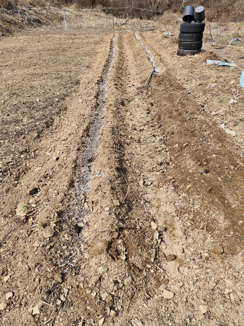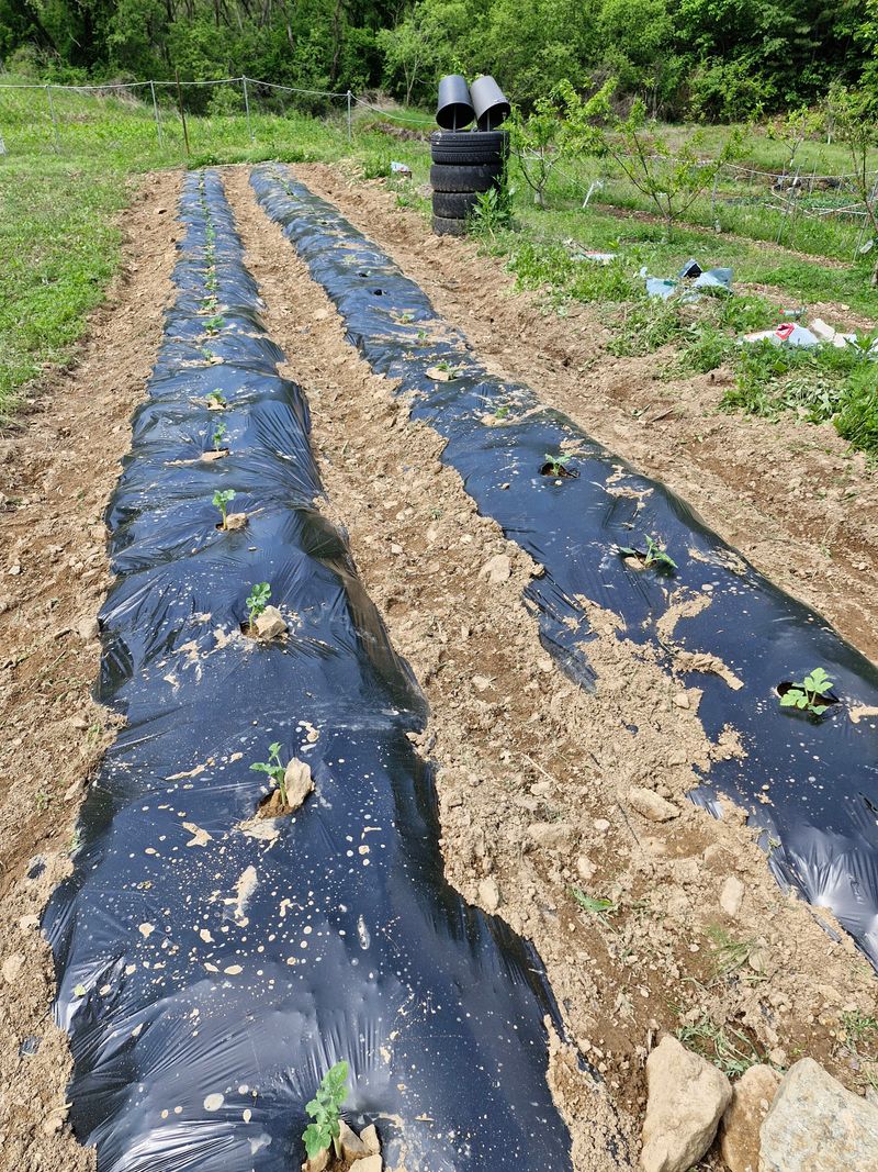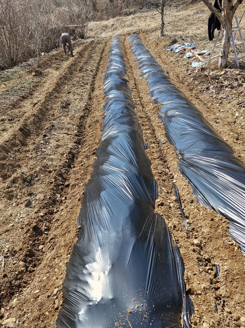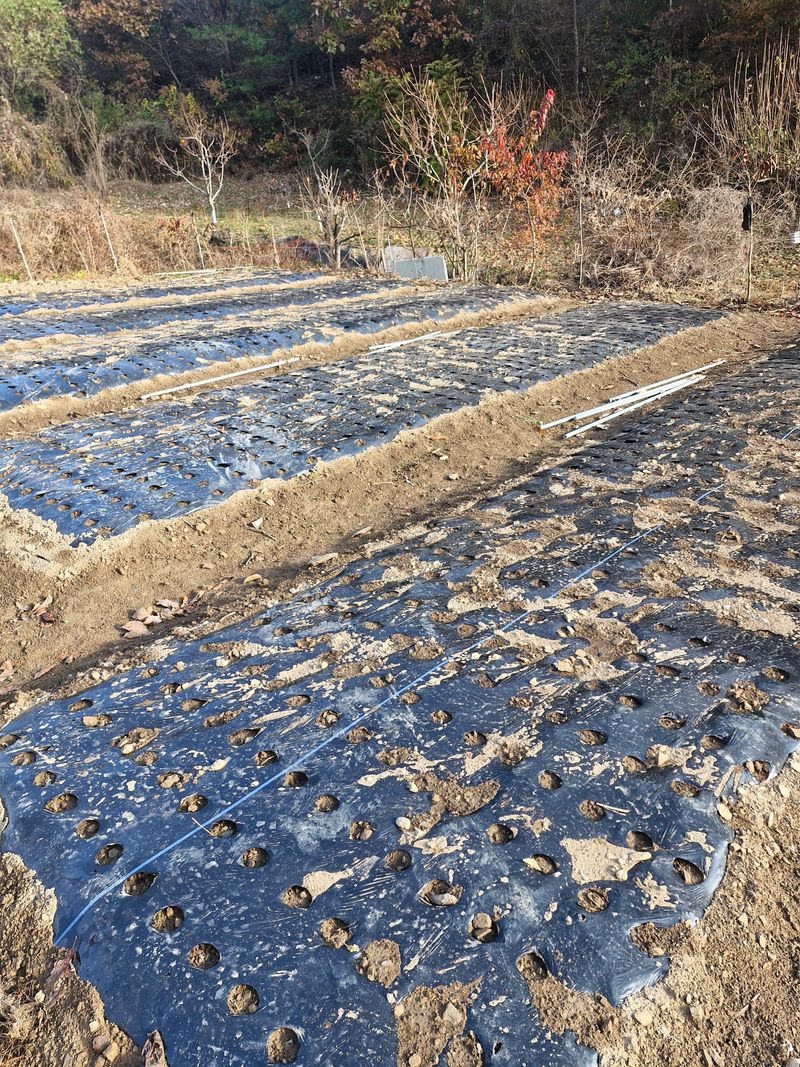 1. 15일 전에 밑거름(퇴비, 유박 복합, 토양살충제)를 살포한 자리에 오늘 청양고추 50cm 간격으로 66개 심을 이랑을 만들고 비닐멀칭 완료 하고, 2. 똑 같은 밑거름에, 유니칼슘 을 추가 하여 대파 심을 이랑 을 만...