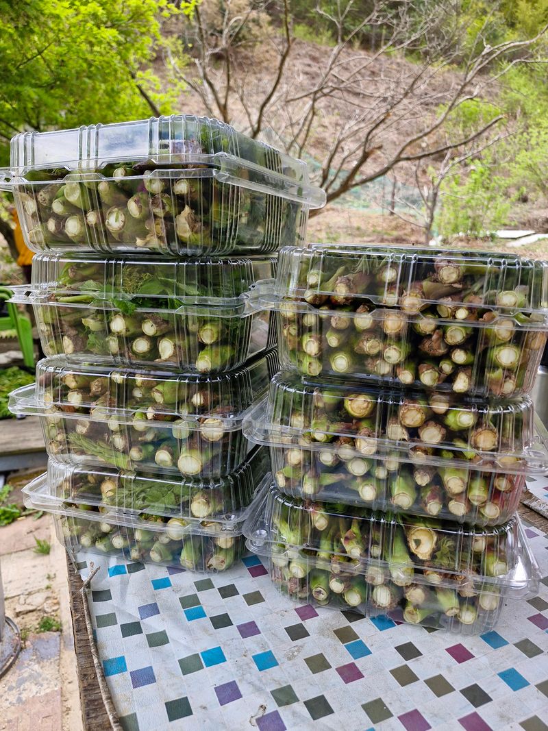 오늘은 참두릅 채취하여 주문량 10kg 서울로 택배 발송함. 추가로 머위순, 참취나물 덤으로 보내줌. 채취시기를 이틀 정도 늦어서 상품성이 좀 떨어져서, 사전에 주문 고객에게 양해를 구했슴.