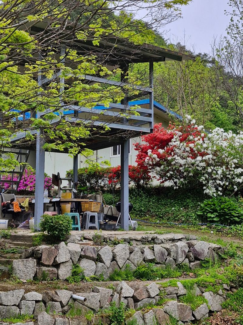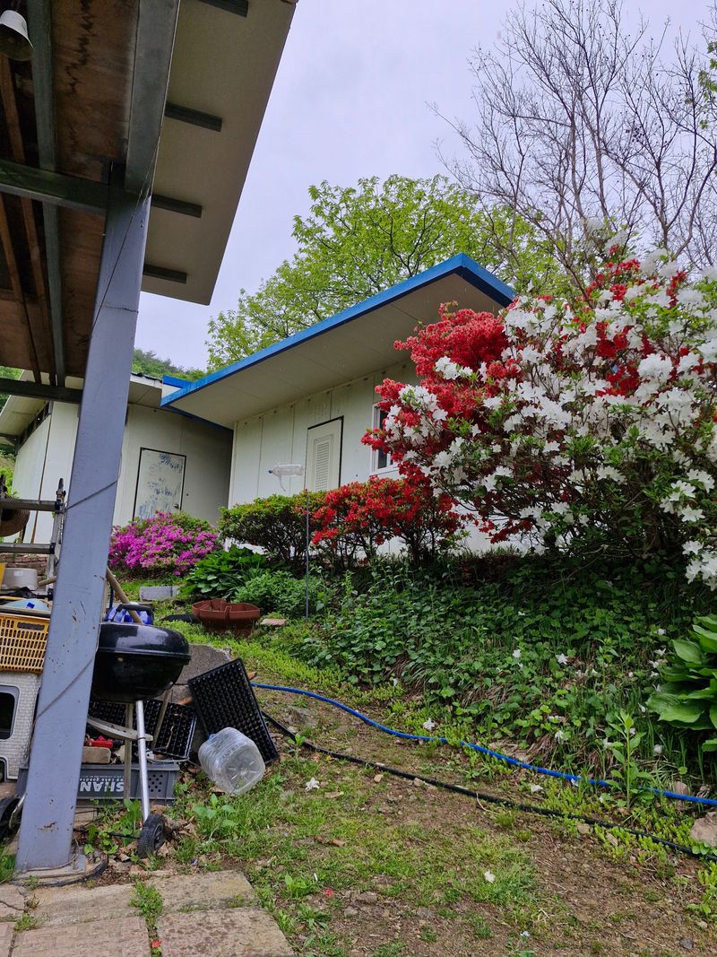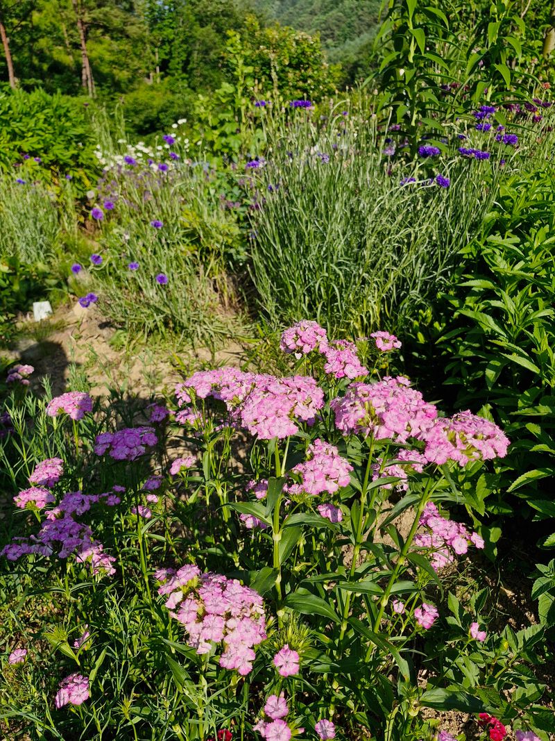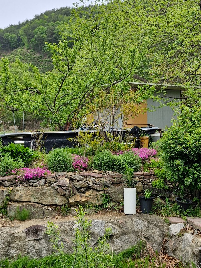 오늘은 1.도마도 지지대 설치 하고, 감자밭 과 마늘밭 잡초제거를 했습니다 2. 수박 적심을 하고, 자두나무 지지대를 설치 했습니다. 3. 농막 꽃밭에 만화가 만발 했답니다. 가장 정을 쏟은 흑장미가 드디어 활짝 피었네요.