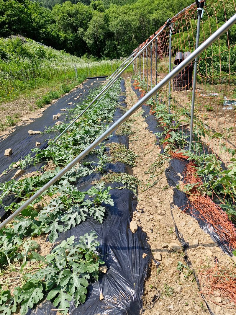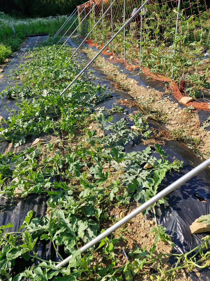 일기 예보가 오후1시부터 소나기가 온다고 한다. 자두 1차 알속기 끝내고, 방제를 해야하는데 하늘이 도와 주질 않는다. 애플수박 지지망설치 작업을 하고, 복 수박 넝쿨자리에 미리 제초매트 설치 작업을 하는동안 소나기는 커녕, 이슬비 한방울도 않온다 오늘은 일기예보가 엉...