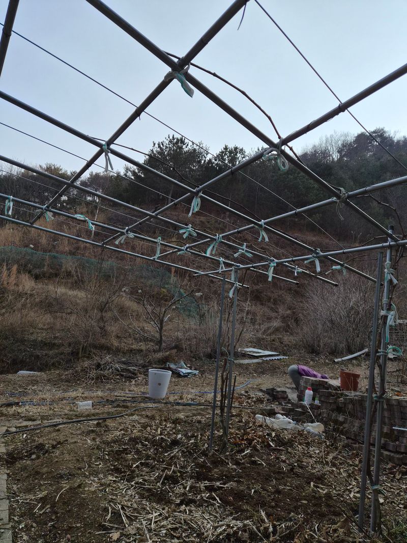 겨우내 우리아파트 노인당에서 고 스톱 즐기다가, 오늘은 날씨가 다소 올라가기에 밭에 왔다. 2년생 포도 샤인머스켙을 두구루 이식 해 놓고, 2년동안 방치 해 놨더니 넝쿨이 춘향이 쑥대머리 같다. 지지대를 설치 하고 넝쿨을 정리 해서 지지대 위로 유인 작업을 하고 완숙...